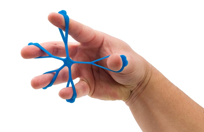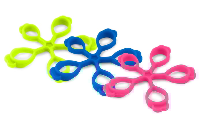 efectivo para ejercitar los músculos de la mano. El conjunto consta de tres bandas elásticas con diferentes resistencias.