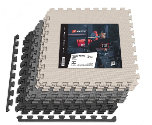 La alfombra Puzzle EVA 1cm 9 piezas HS-A010PM negro/blanco/gris es un producto versátil, que proporcionará una protección ideal del suelo durante los entrenamientos en casa.