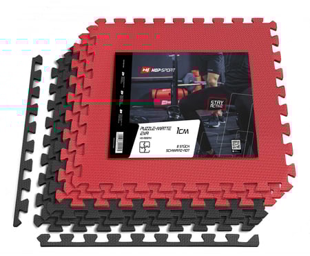 Alfombra puzzle negro/rojo con un grosor de 1cm. Sirve como base para equipos de entrenamiento de fitness o como alfombra educativa material impermeable