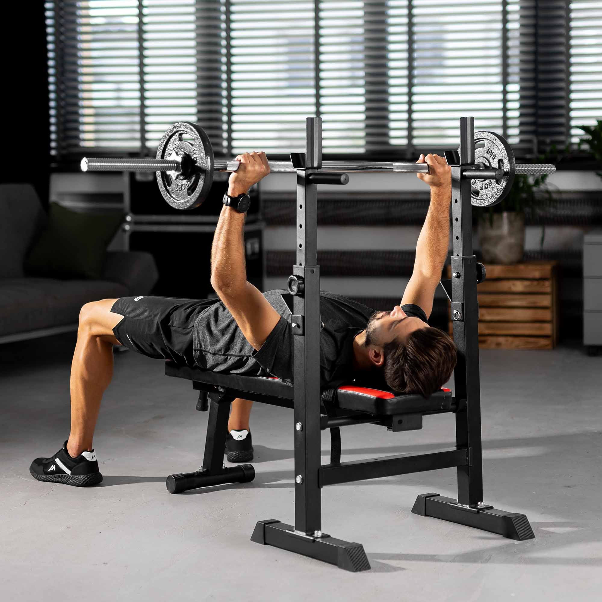 En este banco puedes ajustar la altura de los soportes para la barra, lo que permite adaptar el banco de entrenamiento a las necesidades individuales. La regulación de la altura de los soportes es posible en 5 niveles. Los soportes están equipados con seguridad , lo que aumenta la seguridad durante el entrenamiento.
