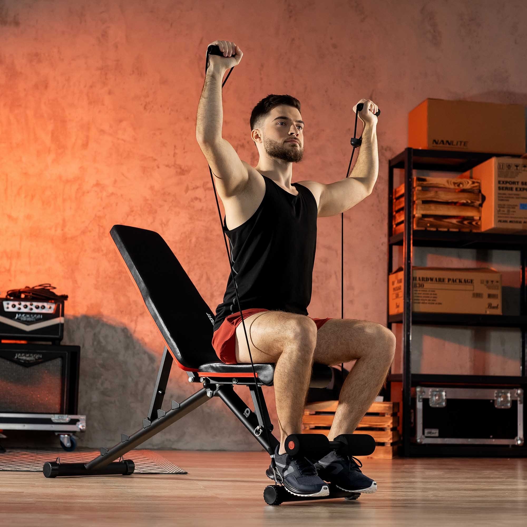 Al banco 2030HB se le incluyen expansores. Se pueden enganchar, mediante mosquetones, tanto en la parte delantera como trasera del banco . Entrena con los expansores en diferentes posiciones: sentado en el banco de frente, de pie frente al banco, acostado sobre la espalda y acostado sobre el abdomen. En cada una de ellas ejercitas diferentes grupos musculares. El entrenamiento con expansores puede servir como calentamiento antes del entrenamiento principal con mancuernas o barra.