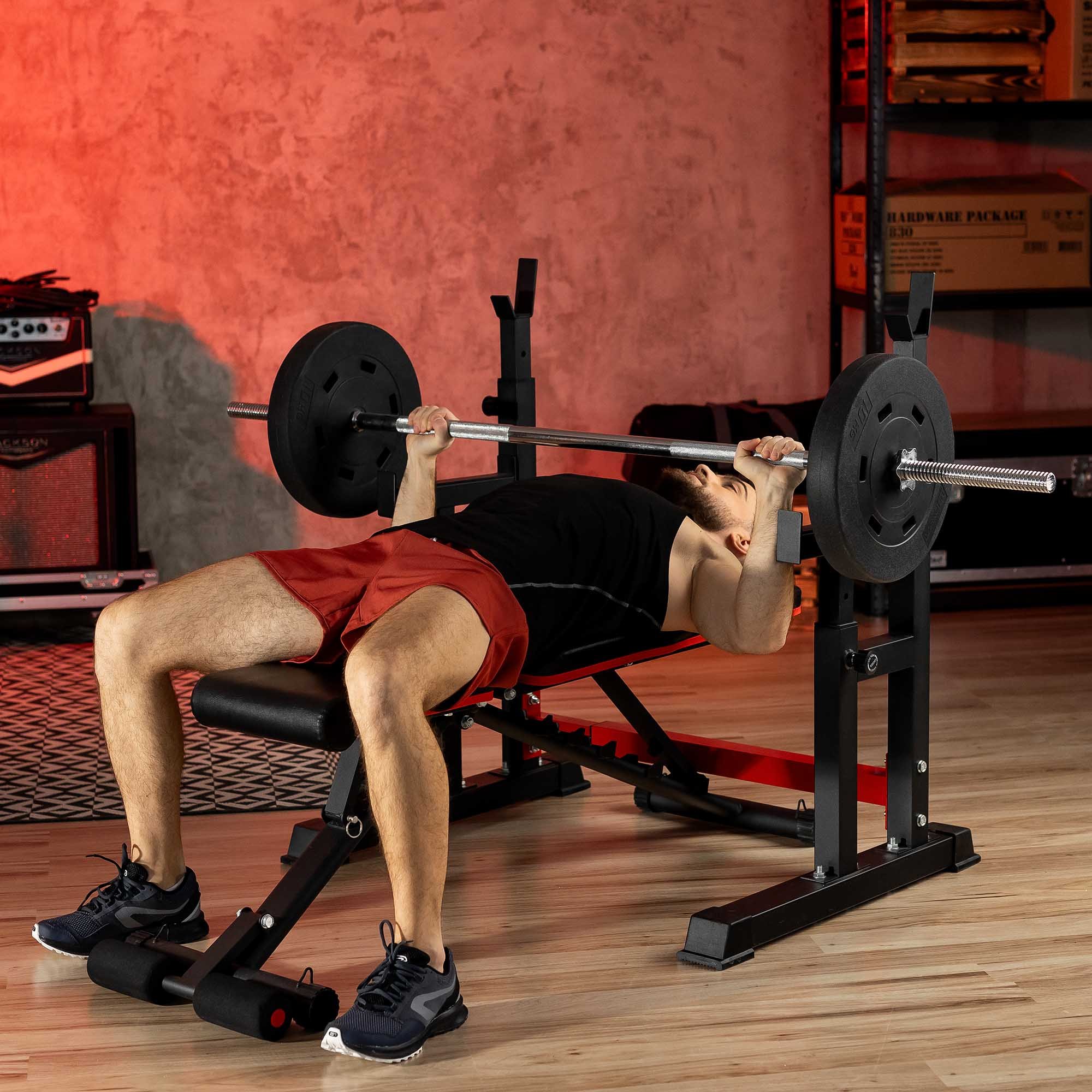 El respaldo y el asiento están construidos con varias capas : una tabla que asegura la estabilidad de la construcción, espuma gruesa que proporciona comodidad durante los ejercicios y un revestimiento agradable al tacto con efecto de cuero natural. Todo está montado sobre una construcción fuerte y resistente. Los perfiles de acero y las placas gruesas conectan los diferentes elementos del banco y aseguran la estabilidad y durabilidad del equipo . Gracias a la más alta calidad de fabricación, el entrenamiento en el banco es seguro y placentero.