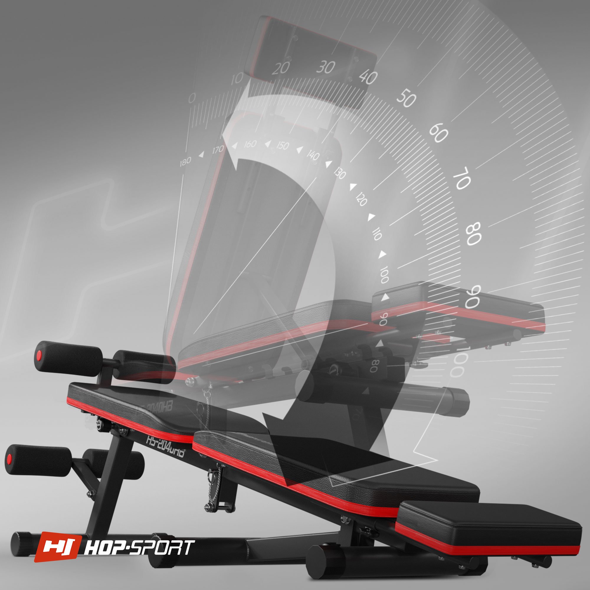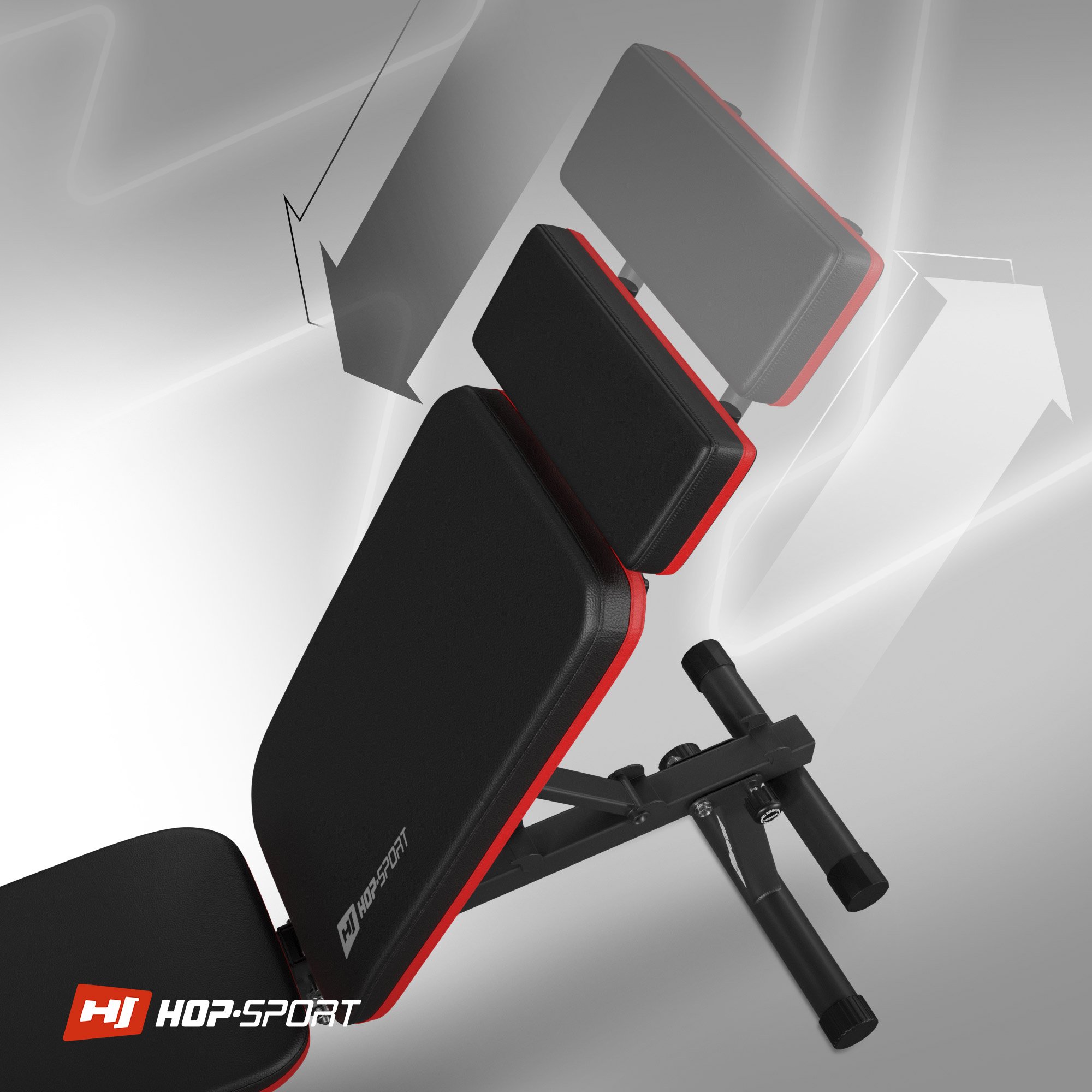Banco inclinado HS-2040 de la marca Hop-sport con posibilidad de plegado, ajuste del reposacabezas y ángulo de inclinación. Ajuste multietapa, construcción duradera