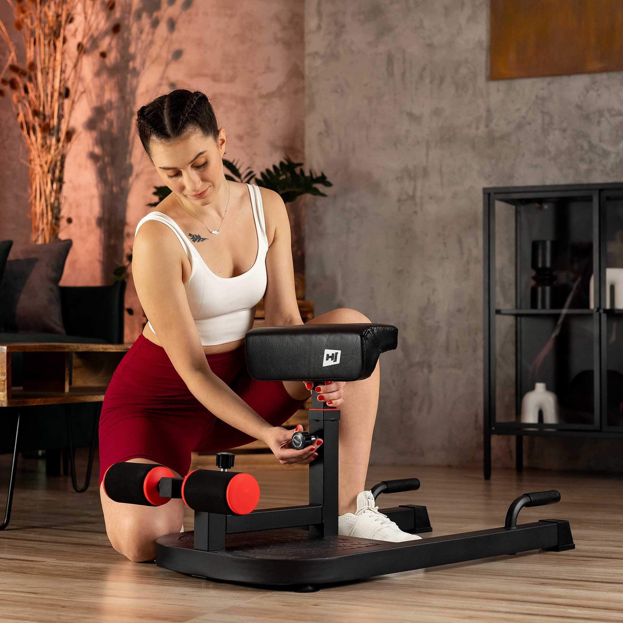 El banco HS-2020 SM es un dispositivo compacto en el que puedes realizar diferentes ejercicios: sentadillas "sissy", abdominales, flexiones, ejercicios de espalda. La construcción del banco asegura la correcta ejecución de los ejercicios - garantía de la máxima eficiencia del entrenamiento. Las sentadillas "sissy" están destinadas a ejercitar la parte inferior del músculo cuádriceps, así como los músculos de las pantorrillas, glúteos y parte posterior del muslo. Este tipo de sentadilla también desarrolla el equilibrio . Gracias al bloqueo de pies, realizarás correctamente los abdominales normales y con giros. Con las asas realizarás flexiones normales e invertidas sin preocuparte por tensiones o lesiones en las muñecas. El dispositivo puede servir como banco romano - ajustando el bloqueo a la altura de las caderas se pueden ejercitar los músculos de la espalda, especialmente en el área lumbar.