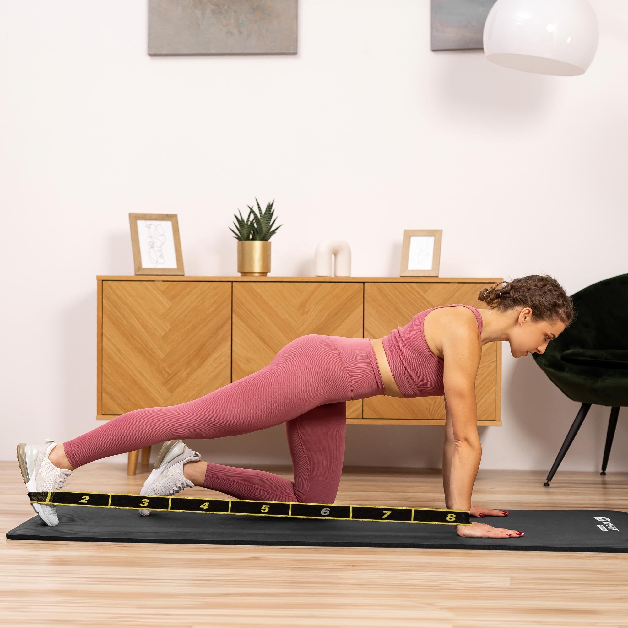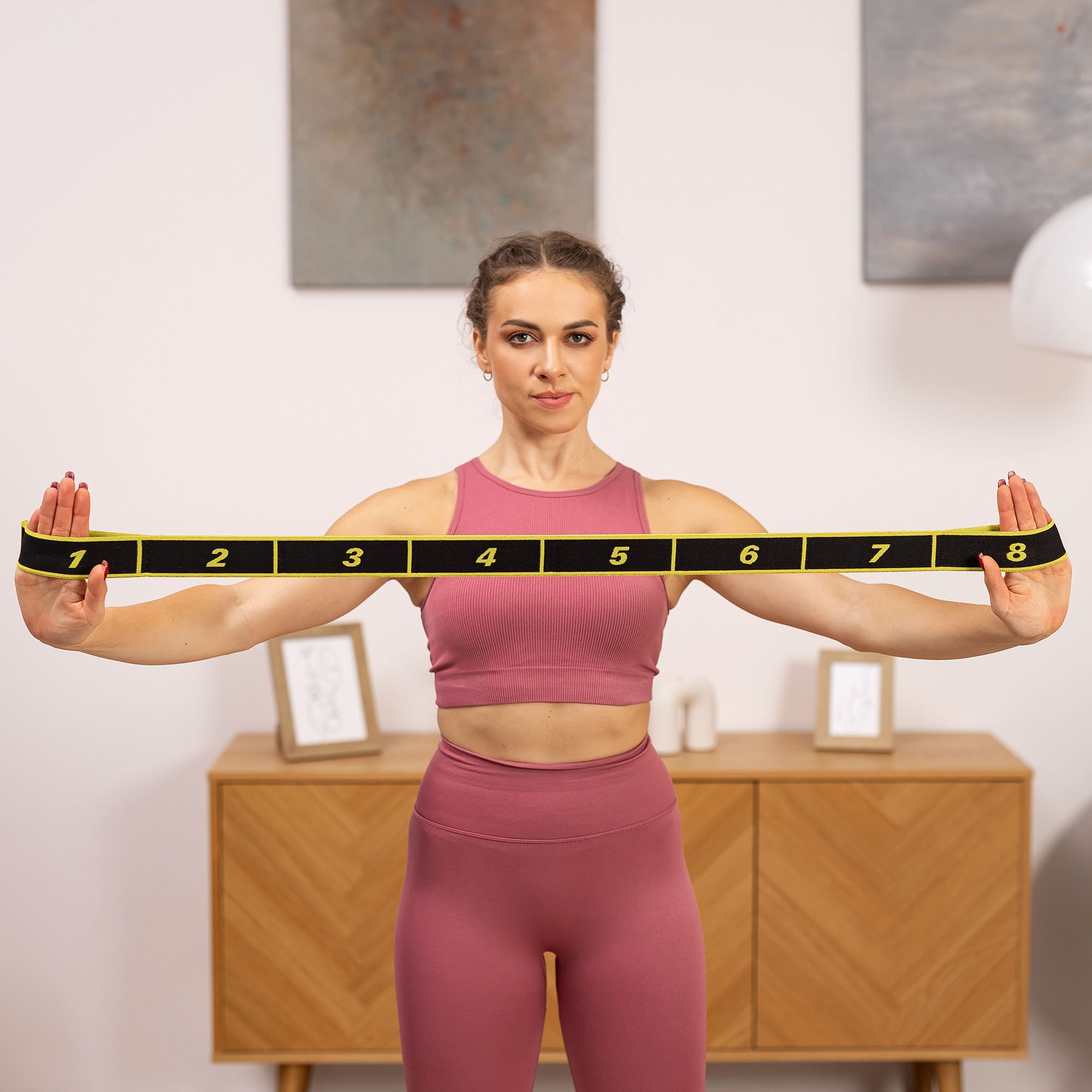 La banda está dividida en 8 bucles más pequeños y uniformes. Gracias a esta división, es fácil ajustar la longitud y la resistencia para un ejercicio específico y las predisposiciones del usuario. Dependiendo del bucle que agarremos, la banda tendrá una resistencia diferente, lo que nos permite ajustar la carga a nuestras propias capacidades. Cuanto menor sea el número de bucles que usemos, mayor esfuerzo se necesitará para estirarlos y más intenso será el entrenamiento.