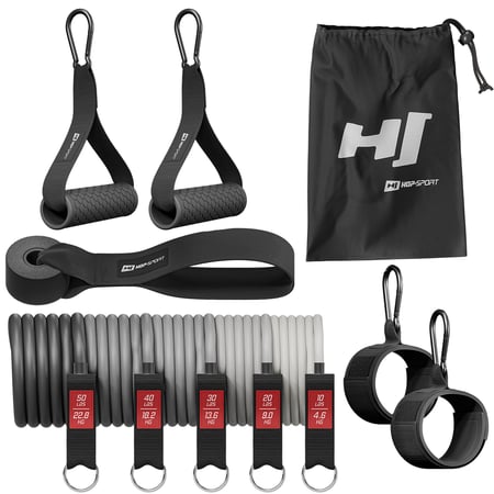 El conjunto de expansores de la marca Hop-Sport consiste en cinco bandas de diferentes resistencias, desde 4,6 kg hasta 22,8 kg. Gracias a esto, puedes ajustar la intensidad de los ejercicios a tus necesidades y aumentar gradualmente el nivel de dificultad. La posibilidad de un sistema de cierre ajustable permite el uso de todas las bandas al mismo tiempo, lo que te permite obtener una carga máxima de hasta 68,2 kg. El conjunto también incluye 2 asas, 2 correas para los tobillos, un anclaje para la puerta y una práctica bolsa de almacenamiento.