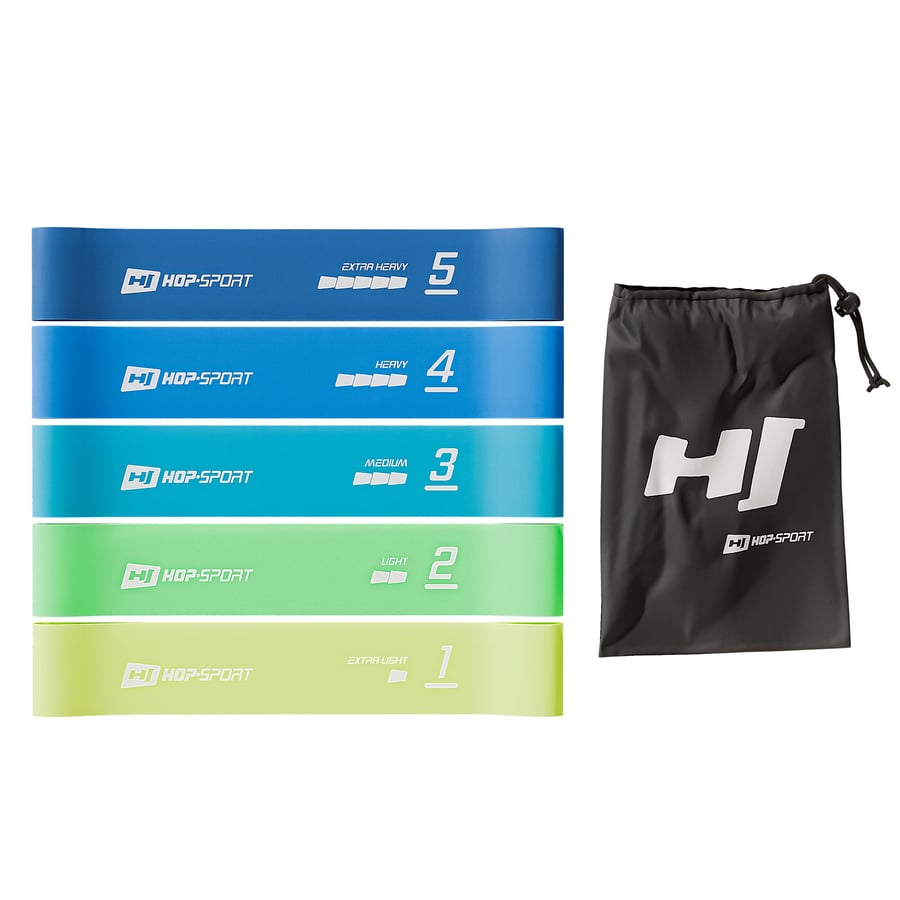 El principio de funcionamiento de las bandas de resistencia es que cuanto más las estiras, mayor resistencia generan. Gracias a esto, puedes ajustar fácilmente la carga al nivel de entrenamiento en el que te encuentras. Cada una de las cinco bandas incluidas en el conjunto HS-L650RLB genera un rango diferente de carga – de la más clara a la más oscura: 2,5-4,5 kg, 4,5-7 kg, 7-9 kg, 11-14 kg, 14-18 kg.