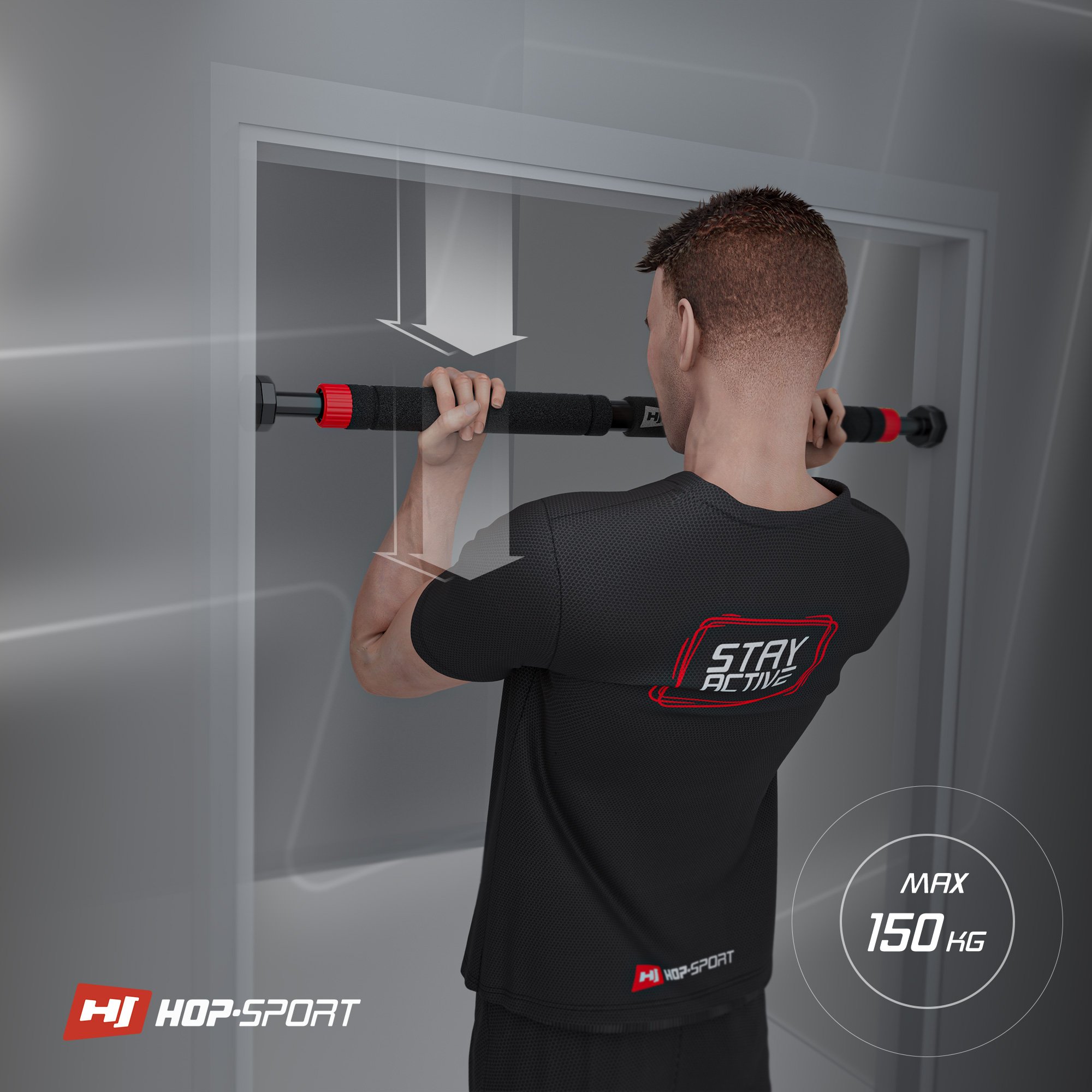 La barra de tracción Hop-Sport cuenta con hasta 8 puntos de presión, ubicados en pies de goma antideslizantes. Esta solución proporciona a la barra una adherencia mucho mejor al marco de la puerta que un sistema basado solo en un punto de presión.