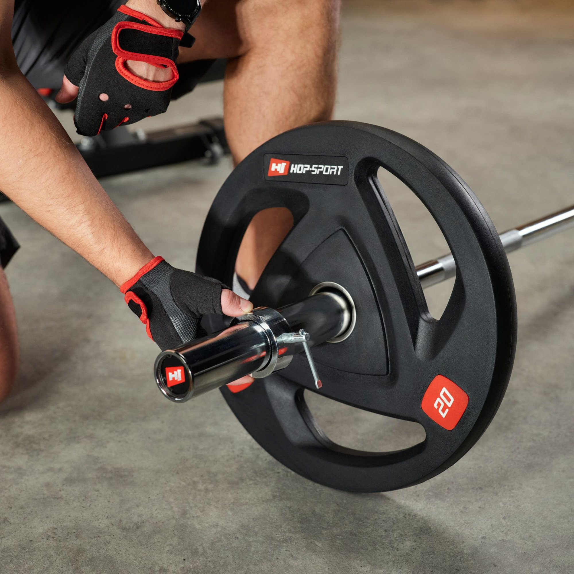 Conjunto de abrazaderas metálicas para barra de la marca Hop-Sport, que se adaptan a todas las barras olímpicas con un diámetro de 50 mm.
