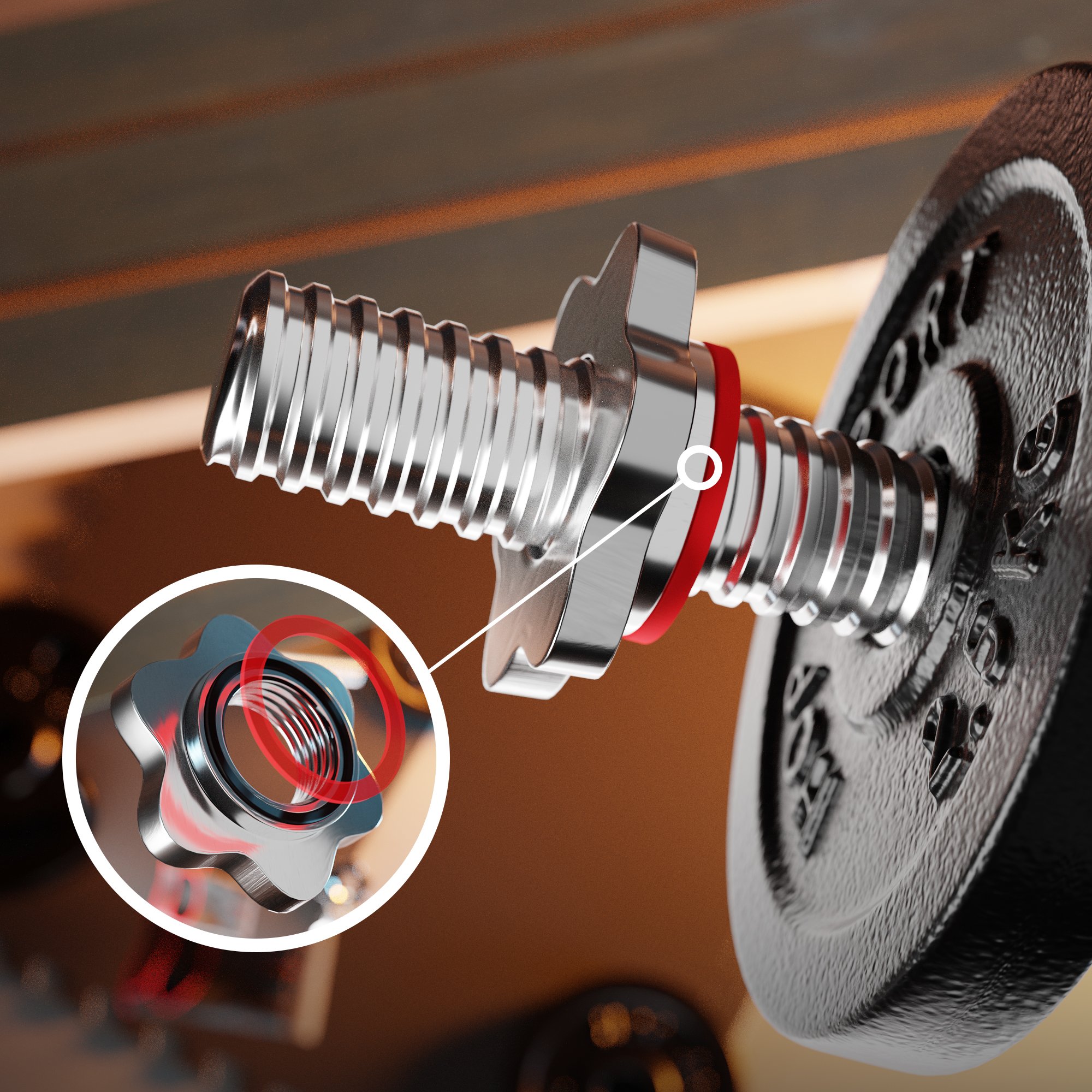 La barra está equipada con extremos especiales con superficie roscada . Los pesos colocados en ellos no se balancean ni se deslizan incluso durante ejercicios intensos. Además, los pesos se aseguran con tuercas cromadas con juntas de goma, que presionan eficazmente los discos de peso en la barra.
