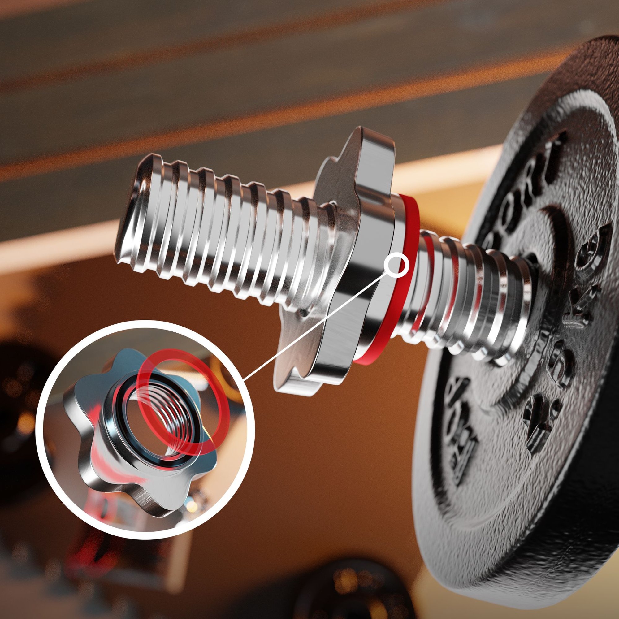 La barra está equipada con extremidades especiales con superficie roscada. El peso colocado en ellas no se balancea ni se desliza incluso durante ejercicios intensos. Además, el peso se puede asegurar con tuercas cromadas que lo presionan. Estas tienen juntas de goma, que estabilizan aún mejor el peso levantado.