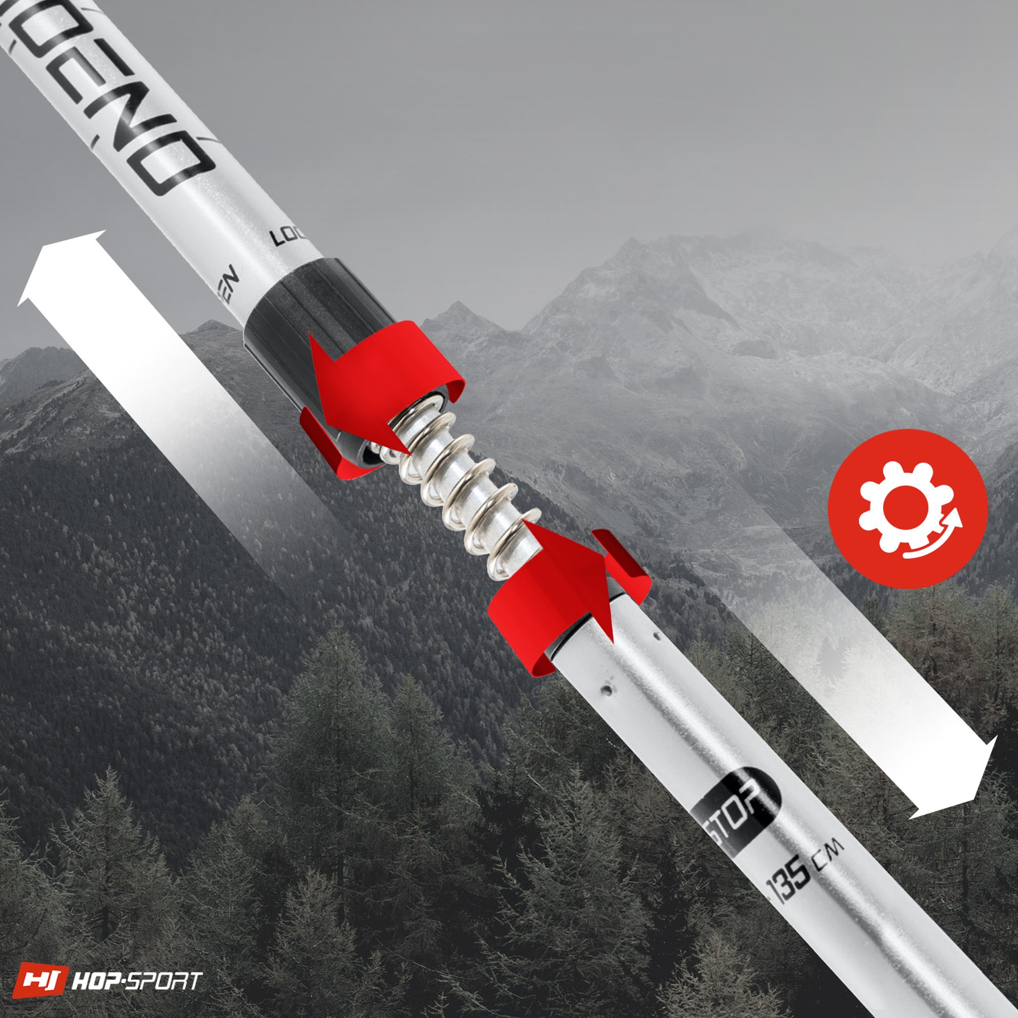 Los bastones Nordend cuentan con un sistema interno de amortiguación de impactos anti-shock, que reduce las vibraciones y los impactos al caminar sobre superficies duras y al descender. Dentro del bastón hay un resorte que, en el ajuste adecuado, proporciona un efecto amortiguador. La activación y desactivación de la función anti-shock se realiza apretando y aflojando el bastón en la parte central, hasta sentir un clic. Al apretar, activamos la función; al aflojar, la desactivamos.