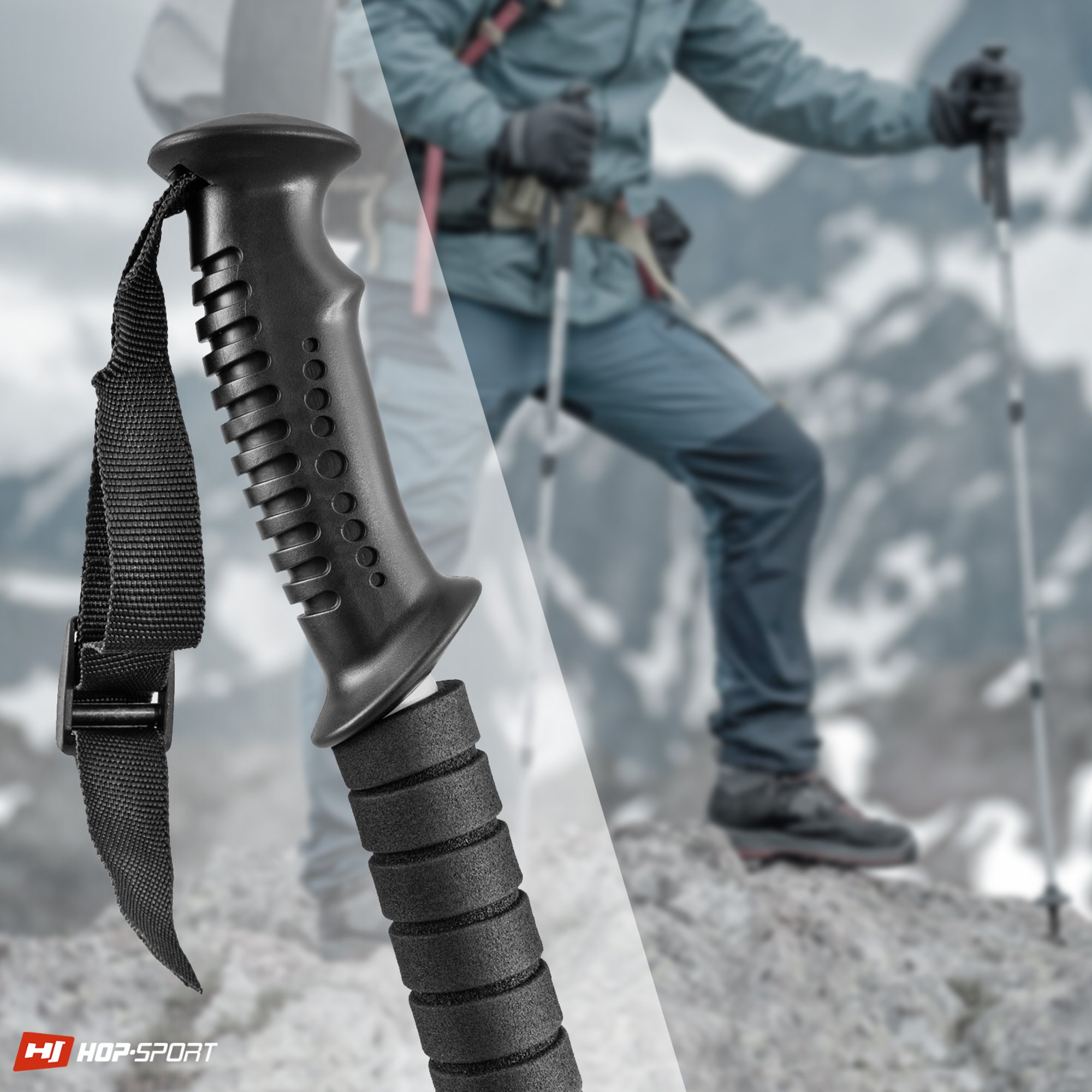 Los bastones están equipados con mangos de plástico perfilados. La estructura ondulada proporciona un buen agarre a la mano. Al mango está unido un soporte especial. Facilita el manejo de los bastones durante la caminata, evita que se pierdan, aumenta la seguridad y permite un fácil transporte.