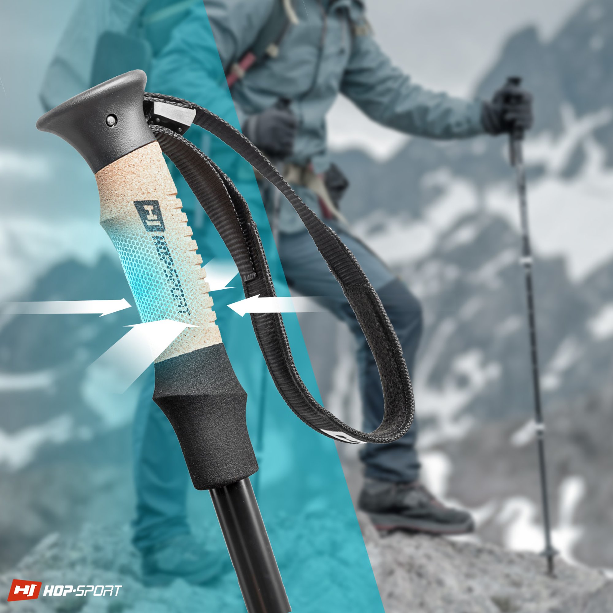 Los bastones están equipados con mangos de corcho perfilados. El corcho absorbe la humedad y el sudor, y su estructura proporciona un buen agarre a la mano. Al mango se le adjunta un agarre especial. Facilita el manejo de los bastones durante la caminata, evita que se pierdan, aumenta la seguridad y permite un fácil transporte. Las cubiertas de las puntas de los bastones incluidas en el conjunto permiten realizar el entrenamiento en diferentes condiciones.