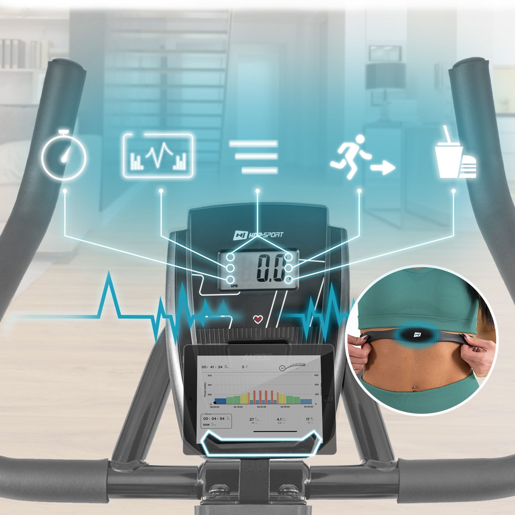 Gracias a la computadora de entrenamiento, en un abrir y cerrar de ojos aumentarás el ritmo, incrementando la carga o la velocidad. La computadora es compatible con la banda telemétrica HS-P095PR (vendida por separado), que permite monitorear el pulso durante el ejercicio. Solo necesitas colocarla en el pecho, encenderla y conectarla mediante Bluetooth con una aplicación deportiva en tu smartphone.