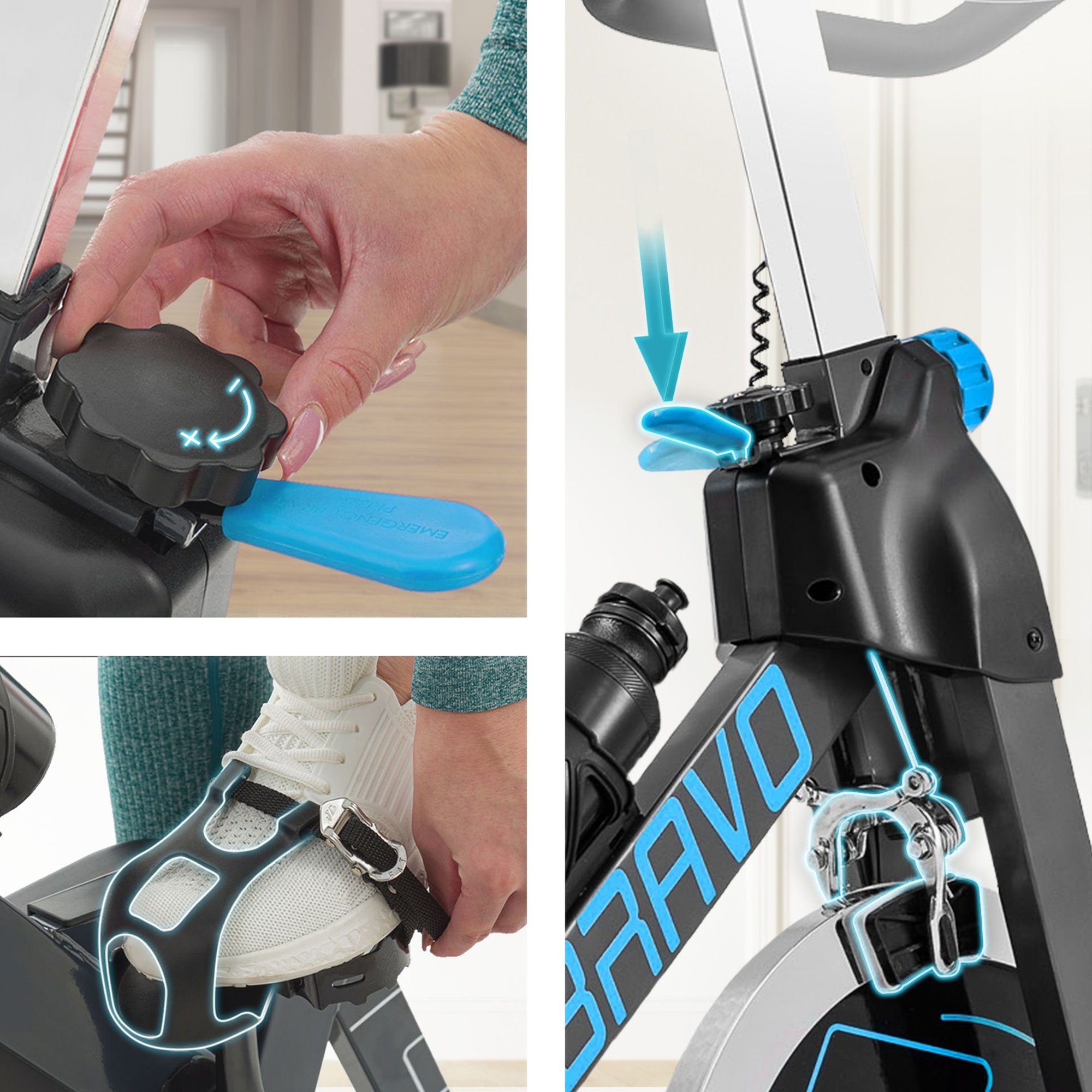 ¡Entrena de manera agradable y, sobre todo, segura con la marca Hop-Sport! Nuestro ergómetro de entrenamiento cuenta con pedales especiales con correas de seguridad en forma de cestas, que evitan que los pies se deslicen incluso durante ejercicios intensos. Además, la bicicleta de spinning es uno de los pocos equipos de fitness equipados con un freno de seguridad justo debajo del manillar. Gracias a él, podrás detener el entrenamiento cuando lo necesites.
