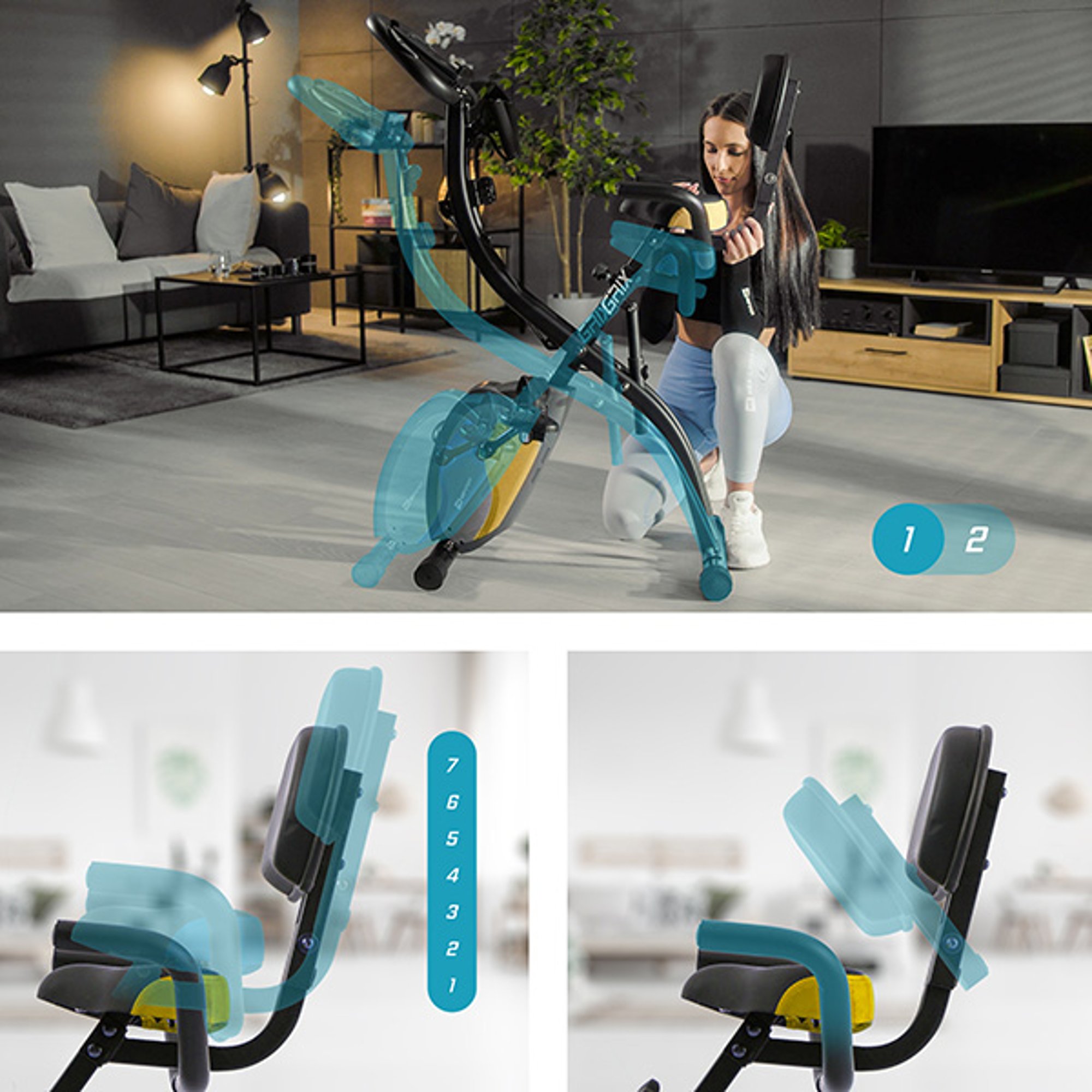 El sillín está hecho de un material grueso para ser más resistente a la abrasión. Además, es agradable al tacto, por lo que incluso durante un entrenamiento prolongado no se siente incomodidad. Lo importante es que existe una posibilidad de ajuste del sillín en siete niveles en un rango de 10 cm y una opción de cambiar el ángulo de inclinación en 2 grados . Grix se caracteriza por tener también asas laterales y respaldo. Al apoyarse durante el esfuerzo físico, se eliminan todas las consecuencias de una postura corporal antinatural, como el molesto dolor de espalda.