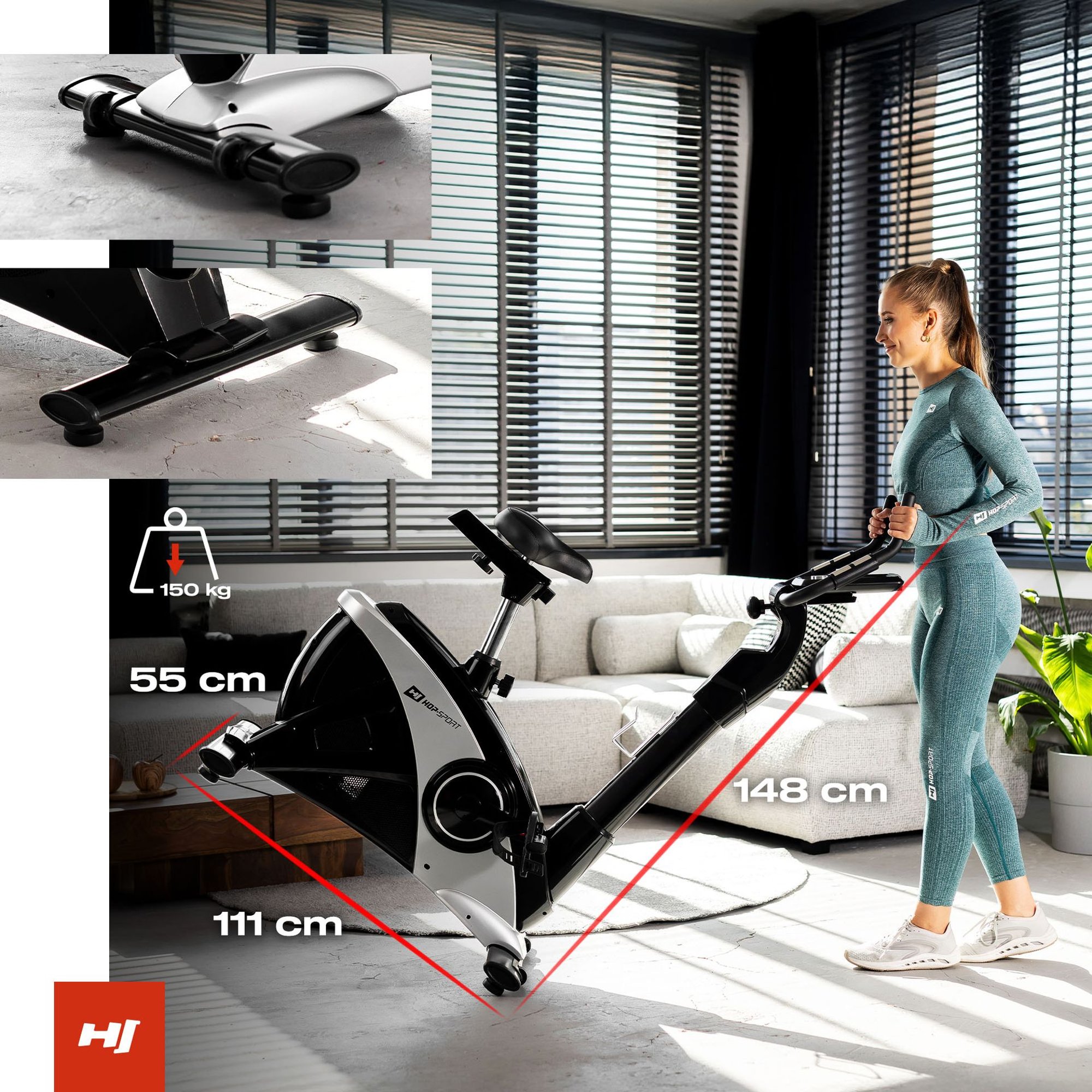 Bicicleta de entrenamiento eléctrica HS-090H Apollo con sistema de resistencia magnética controlado electrónicamente, con computadora equipada con programas de entrenamiento y medición y posibilidad de conectarse mediante bluetooth a las aplicaciones iConsole+training y Kinomap. ¡Entrena con Hop-Sport!