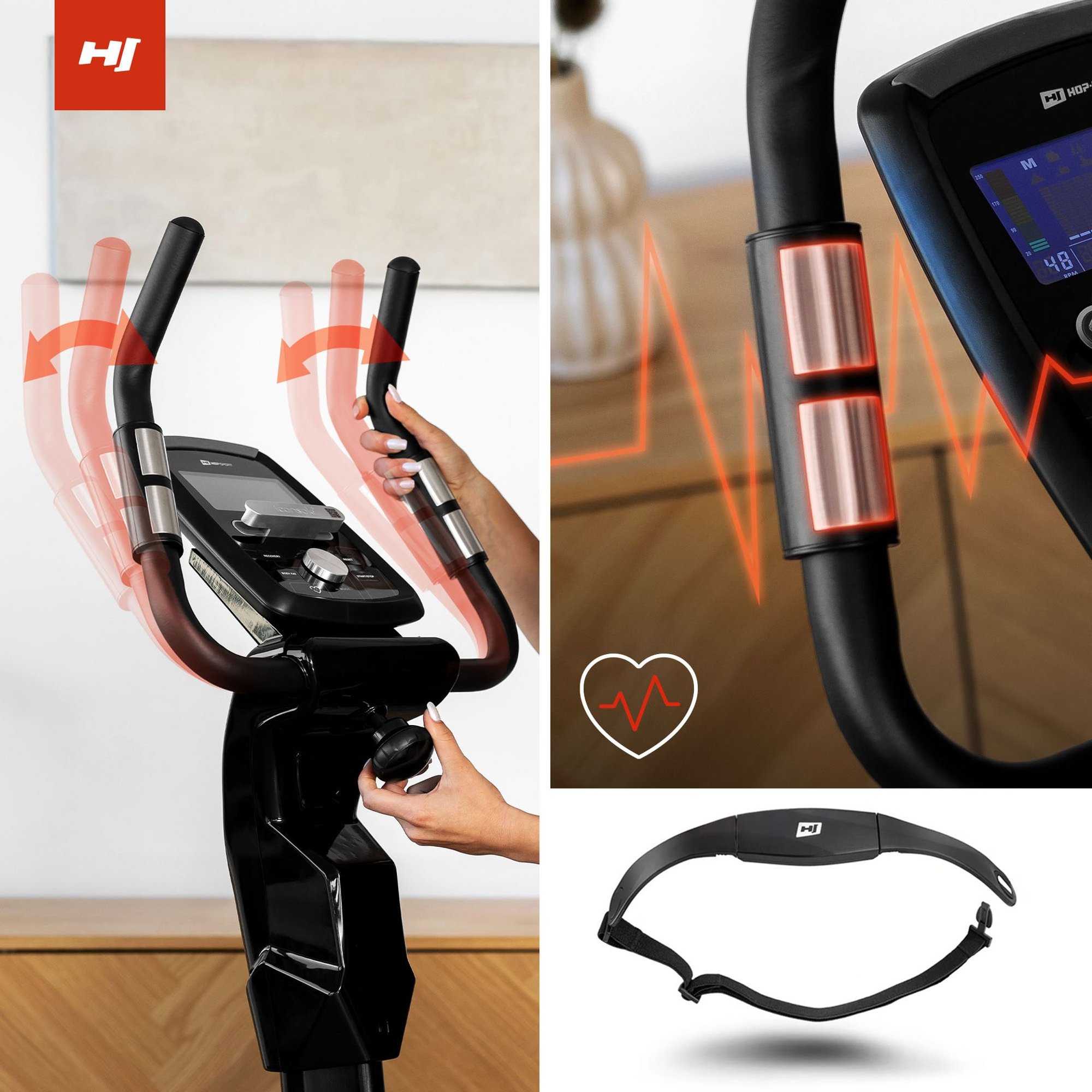Para personas con necesidades de salud especiales o cualquiera que quiera monitorear su frecuencia cardíaca, el modelo Apollo está equipado con dos cómodos sensores de pulso. Los valores del pulso se transmiten a la pantalla a través de sensores táctiles. El ergómetro también es compatible con la correa pectoral Hop-Sport (se pide por separado).