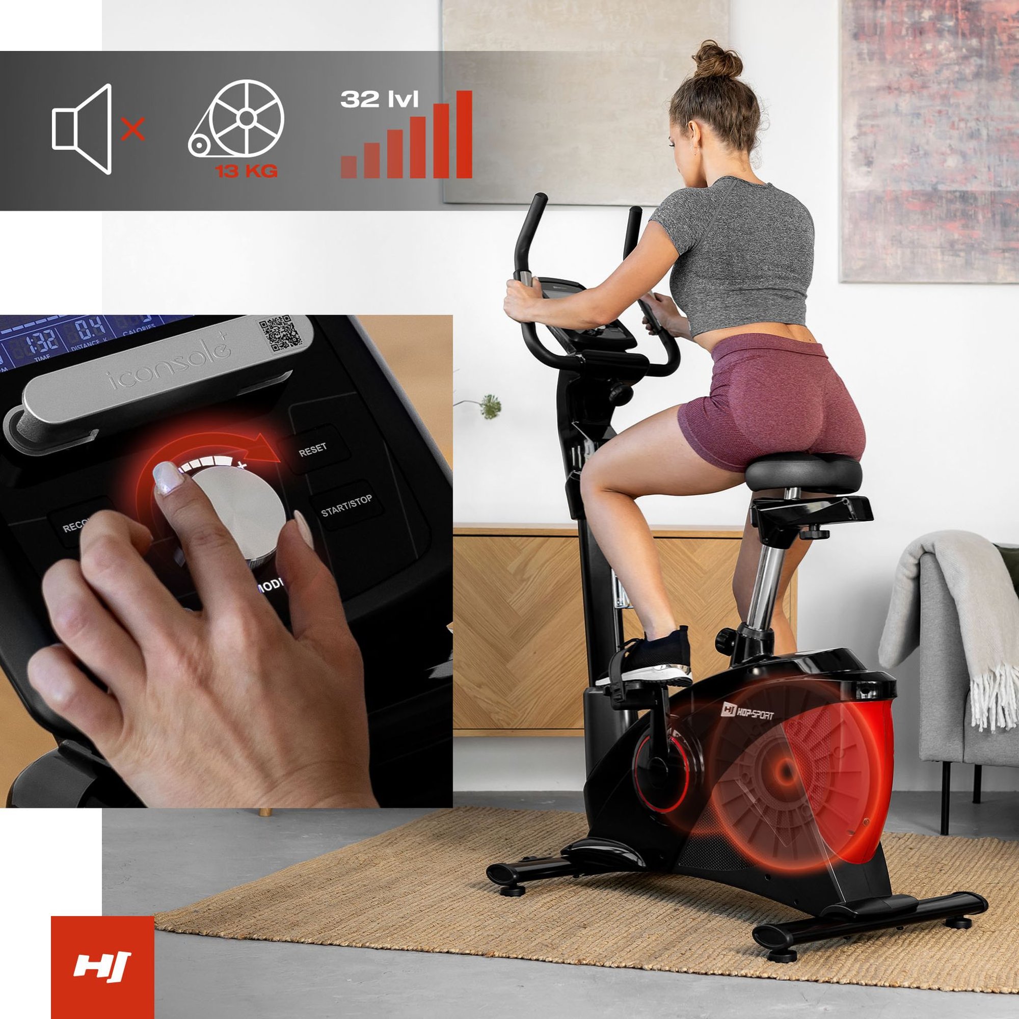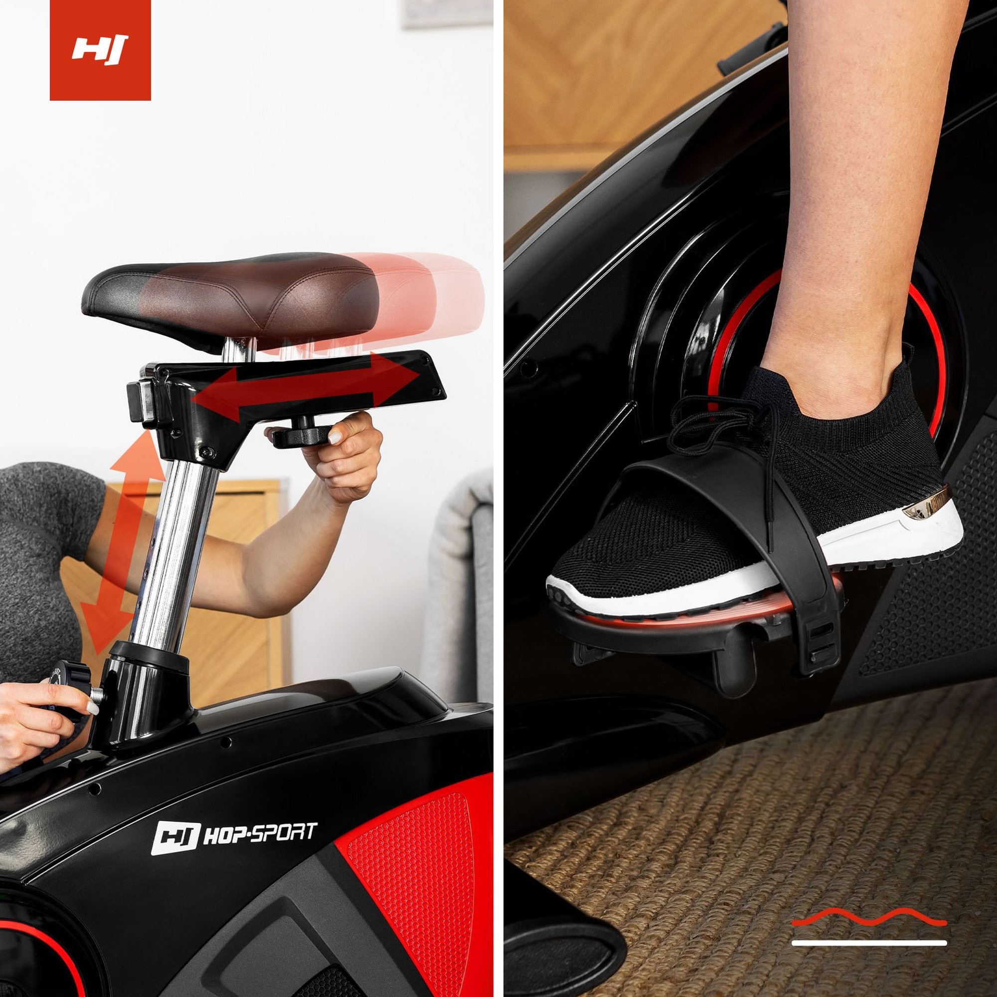 Bicicleta estática eléctrica HS-090H Apollo con sistema de resistencia magnética controlado electrónicamente, con ordenador equipado con programas de entrenamiento y medición y posibilidad de conexión a aplicaciones iConsole+training y Kinomap a través de Bluetooth. ¡Entrena con Hop-Sport!