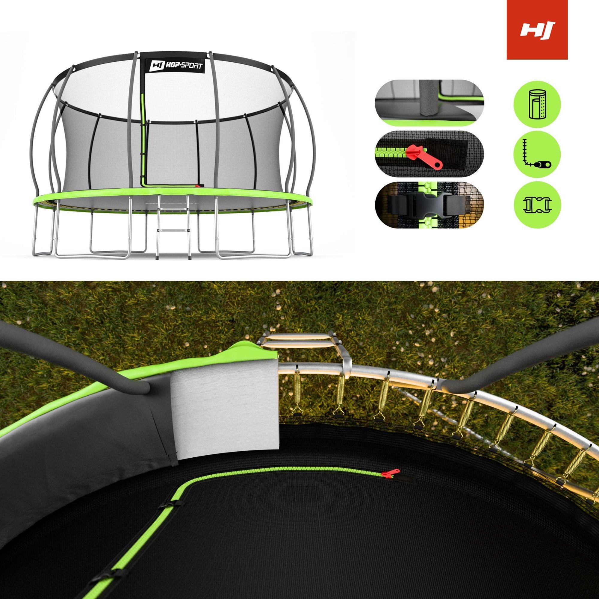 ¿Quieres asegurarte de que tú y tu familia tengan una diversión inolvidable al aire libre? ¡El trampolín de jardín HS-PT14I de la marca Hop-Sport es una excelente elección! Gracias a su alta calidad de fabricación, estructura sólida y numerosas medidas de seguridad, puedes disfrutar de saltos despreocupados en condiciones completamente cómodas y seguras. Este modelo se destaca por su diseño interesante y red interior innovadora tipo "calabaza", que proporciona aún más comodidad al usar el trampolín.