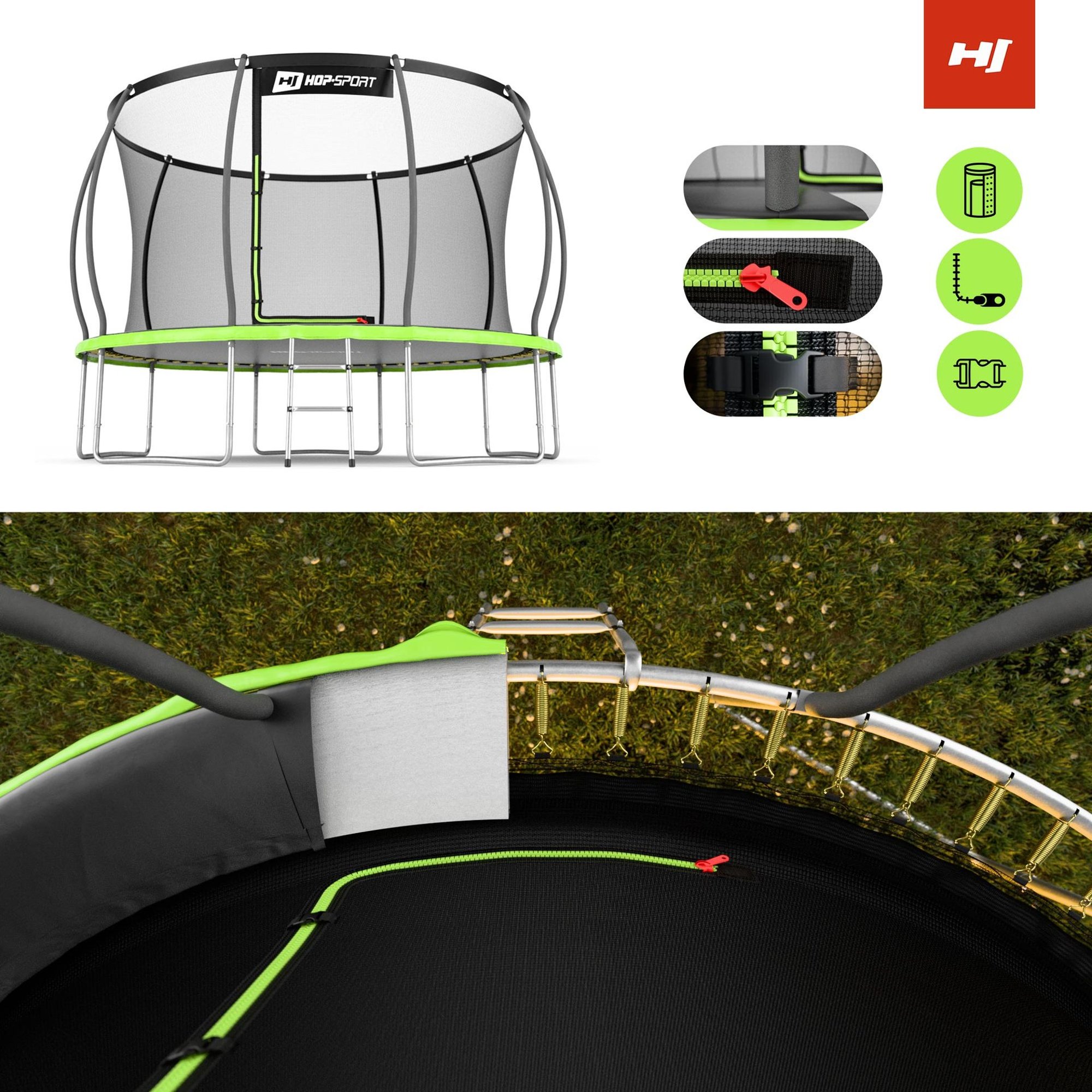 La cama elástica Hop-Sport HS-PT12I es una excelente elección para toda la familia! Es ideal tanto para el uso diario como para reuniones familiares o eventos al aire libre. La estructura sólida y las numerosas medidas de seguridad garantizan un juego seguro y cómodo para niños y adultos. Además, la cubierta protectora de los resortes es resistente a los rayos UV, lo que garantiza su durabilidad a largo plazo y un aspecto estético durante años.