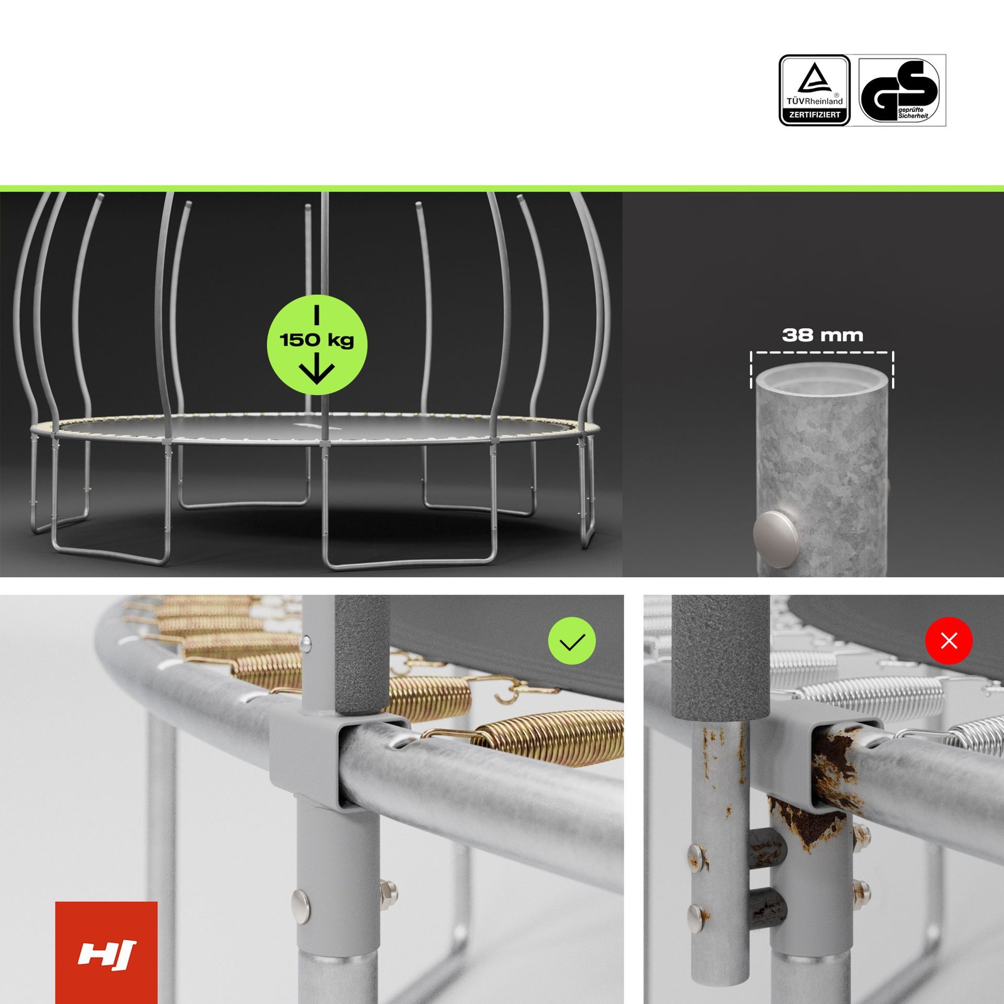 El trampolín HS-PT16I está diseñado para un uso prolongado y la máxima estabilidad. Su marco de acero galvanizado es resistente a la corrosión, lo que hace que el trampolín sea ideal para diversas condiciones climáticas. Las innovadoras conexiones en forma de "T" aseguran un montaje fácil y rápido, y las cuatro patas sólidas de sección gruesa garantizan estabilidad durante los saltos. El peso máximo del usuario de 50 kg y las certificaciones TUV/GS Intertek confirman la alta calidad y seguridad del producto.