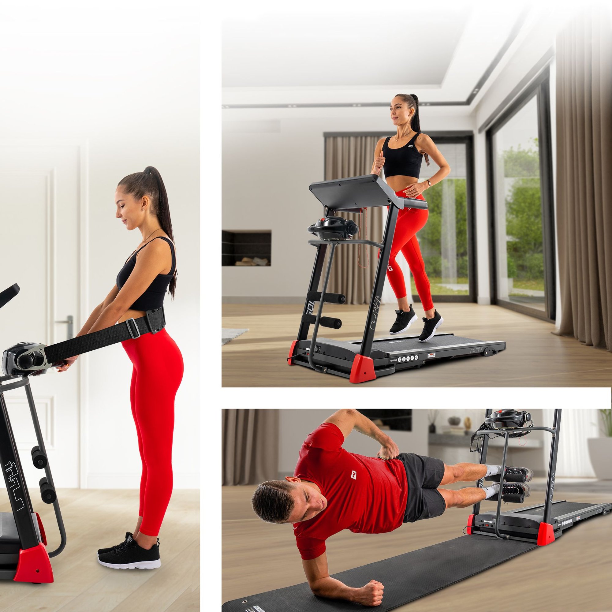 La cinta Soul permite realizar un entrenamiento cardiovascular completo, que en cualquier momento puedes complementar con ejercicios para el abdomen y los músculos del core, utilizando los soportes integrados para realizar abdominales. Después del esfuerzo, utiliza el masajeador con correa ajustable, que relaja los músculos y reduce eficazmente el riesgo de agujetas.