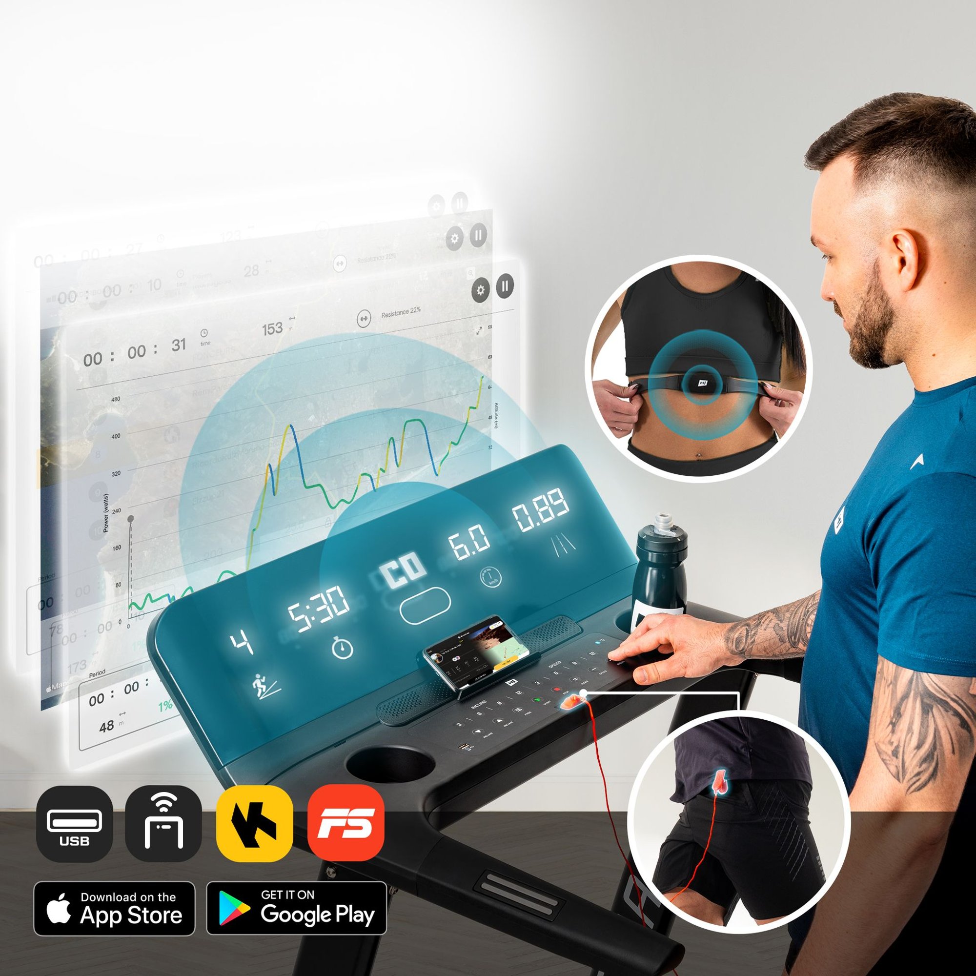 Los entrenamientos en la cinta pueden volverse monótonos con el tiempo, pero no en el caso de que tengas a tu disposición aplicaciones de entrenamiento dedicadas FitShow y Kinomap ! Gracias a ellas, puedes disfrutar de rutas virtuales, mapas con modo callejero o planes de entrenamiento adicionales. Incluso puedes comparar tus resultados con otros usuarios y compartir tus progresos en las redes sociales. El modelo Estima también cuenta con módulo USB, Bluetooth, función de streaming, y posibilidad de controlar el pulso gracias a los sensores en los manillares