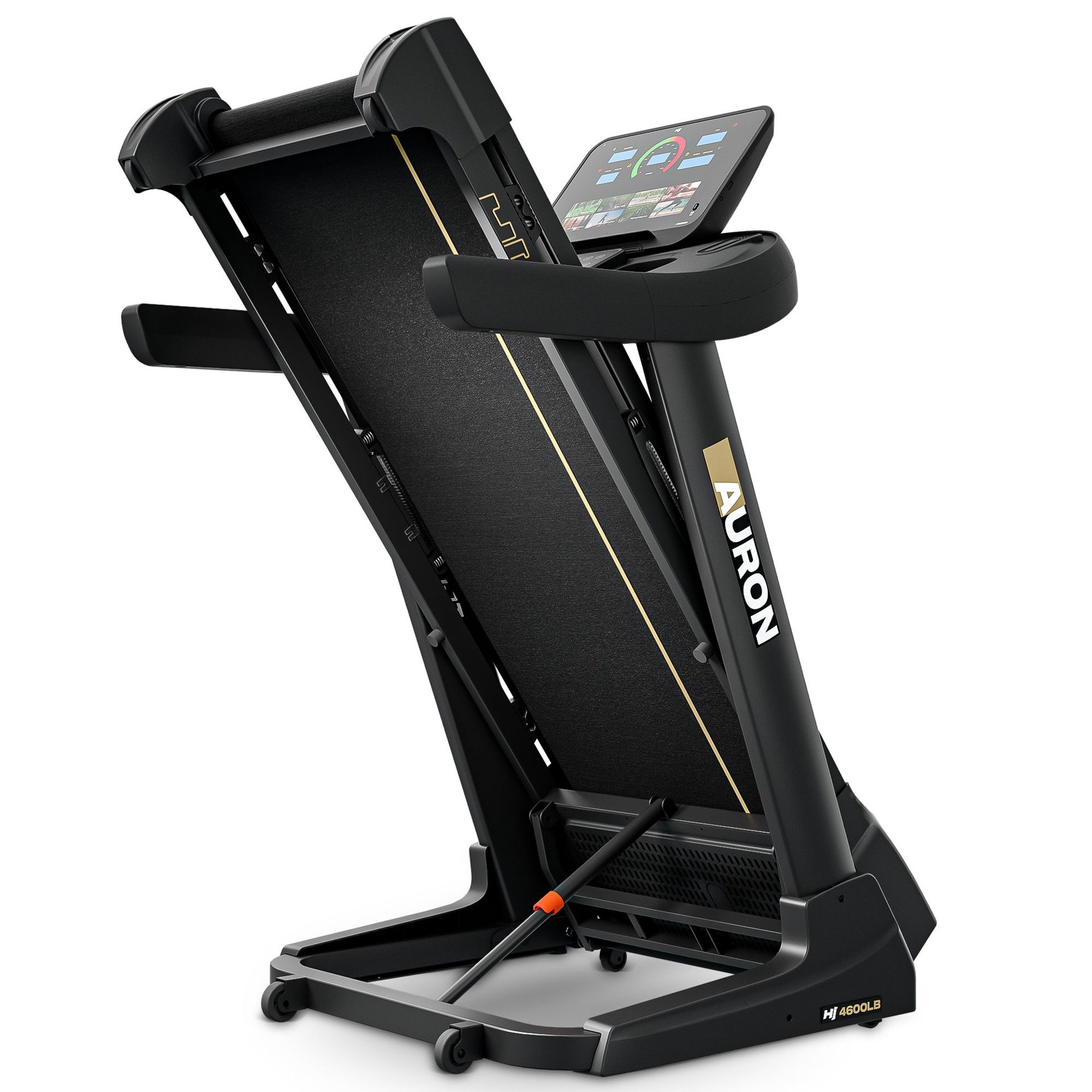 Después del entrenamiento, la cinta de correr eléctrica doméstica Auron se pliega en pocos segundos. Las ruedas de transporte integradas permiten moverla fácilmente a otro lugar sin necesidad de levantar su peso. Es una cinta de correr eléctrica moderna y eficiente que combina excelentes prestaciones con la comodidad del uso diario.