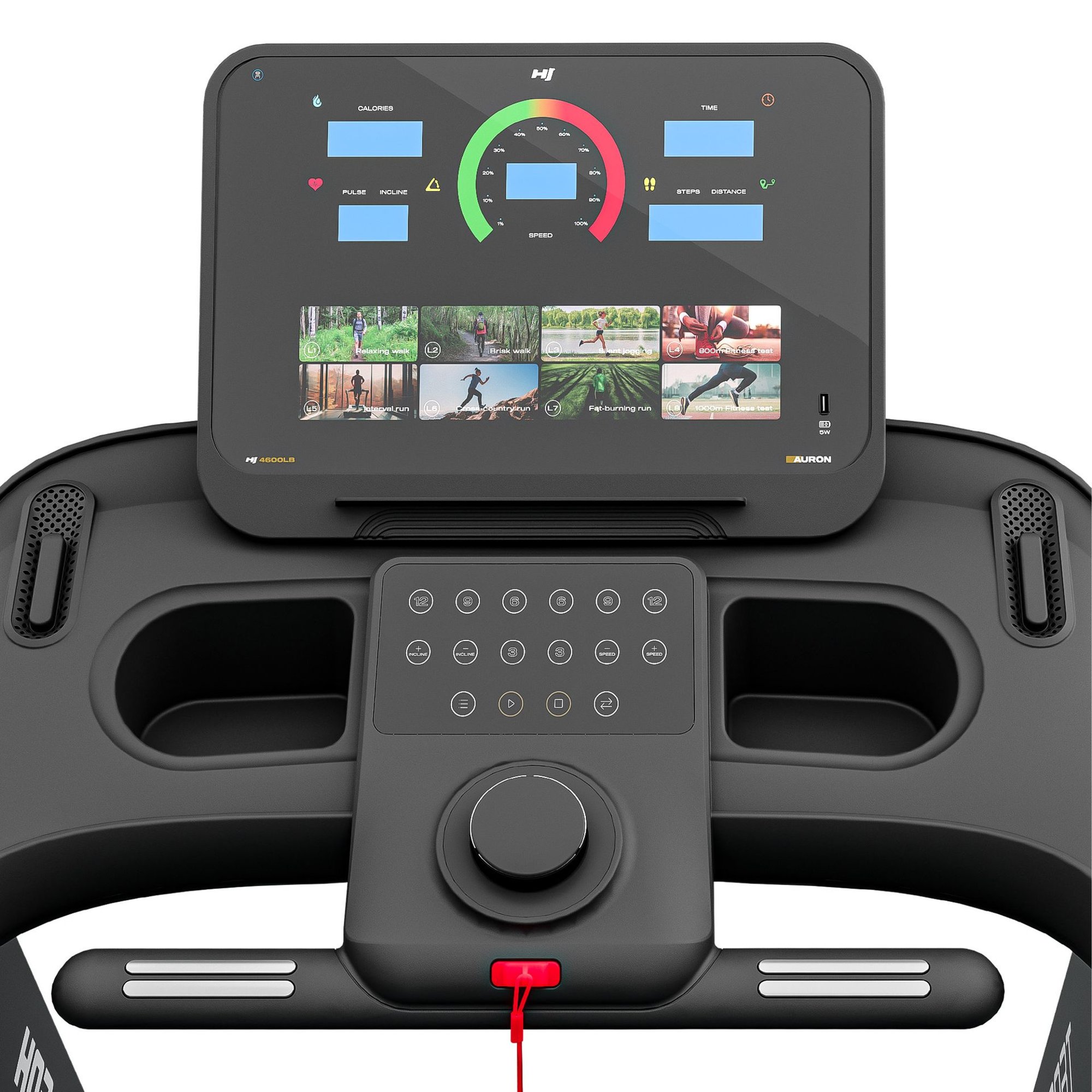 La cinta de correr eléctrica HS-4600LB Auron ofrece desde el primer uso una sensación total de control del entrenamiento. El gran panel de fácil lectura muestra todos los parámetros clave: velocidad, tiempo, distancia, calorías quemadas, frecuencia cardíaca y ángulo de inclinación de la cinta. Además, dispone de 15 programas predefinidos que permiten ajustar rápidamente la intensidad a tus objetivos, desde una caminata suave hasta una carrera intensa. Gracias al módulo Bluetooth, el equipo se conecta con las aplicaciones compatibles Kinomap, FitShow y Zwift. Solo tienes que descargar una de ellas en tu dispositivo móvil para acceder a nuevas posibilidades: rutas virtuales, competiciones con otros usuarios y entrenamientos guiados. Asimismo, el puerto USB-C permite cargar el teléfono durante el ejercicio.