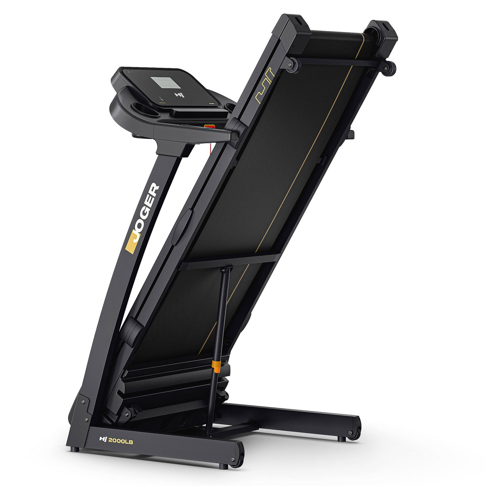 Joger es una cinta de correr plegable que funciona perfectamente en espacios más pequeños. Tras finalizar el entrenamiento, se pliega la estructura y, gracias a las ruedas de transporte integradas, se puede mover cómodamente a otro lugar. Sus dimensiones compactas una vez plegada hacen que no ocupe mucho espacio: puedes colocarla junto a la pared o en una esquina de la habitación.