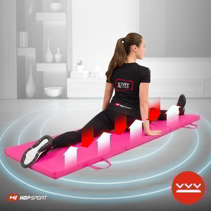 Colchón de gimnasia plegable suave 4 cm HS-064FM rosa del fabricante Hop-Sport te proporcionará una base cómoda y estable para ejercicios con dimensiones de 180 x 60,5 x 4 cm. Debido a su bajo nivel de dureza ( modelo suave ), se recomienda especialmente para yoga y gimnasia estática, recreativa. También es ideal como base para un juego seguro para niños. Gracias a la posibilidad de plegado es muy práctico y conveniente para almacenar y transportar.