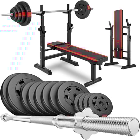 El éxito del entrenamiento de fuerza se basa en aumentar gradualmente el peso de las cargas: solo así los efectos serán rápidos y duraderos. El conjunto de pesas con barra y banco simple con soportes permite entrenamiento de culturismo y desarrollo general.