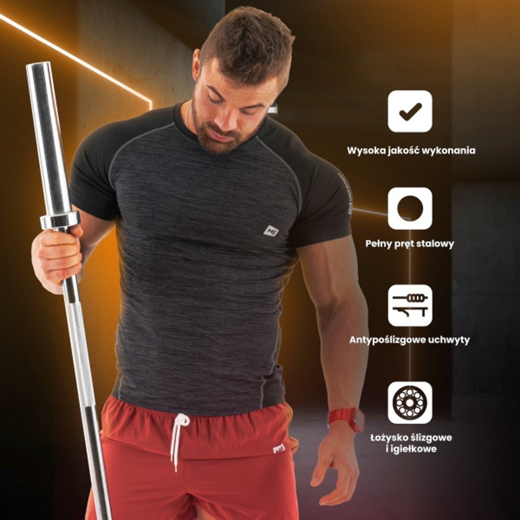 La construcción de la barra olímpica consiste en un eje de acero cromado obtenido mediante un proceso de endurecimiento, lo que elimina el riesgo de deformación o flexión de la barra con el tiempo. El eje no tiene uniones, lo que lo hace mucho más duradero, y su capacidad de carga es de hasta 320 kg . La parte de agarre de la barra tiene un diámetro de 30 mm, lo que asegura un agarre seguro y cómodo.