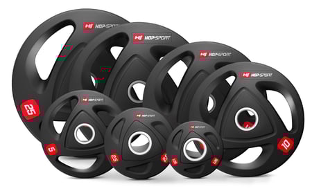 Tres grandes agarres ergonómicos en los pesos más grandes no solo aseguran seguridad y comodidad al transportarlos, sino también su uso versátil. El molde de hierro fundido está recubierto con una gruesa capa de goma duradera que garantiza comodidad de uso, protege el equipo y el suelo de daños y amortigua el ruido de las caídas.