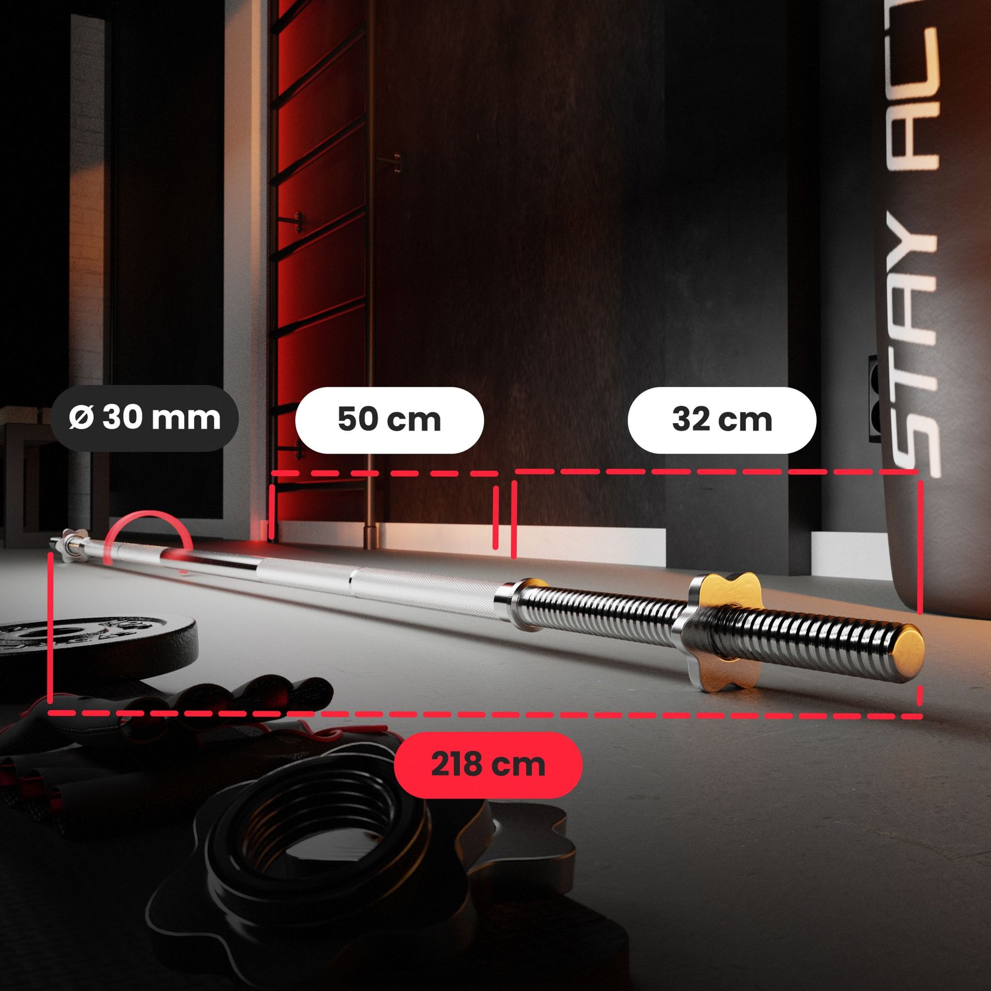 Las dimensiones de la barra han sido adaptadas de tal manera que el entrenamiento con ella proporcione los máximos beneficios. La superficie roscada mide 13 cm, lo que te permite colocar en ella un número óptimo de pesas y ser capaz de progresar en los entrenamientos diarios. La barra de acero de 40 cm, gracias a su parte de agarre estriada, se sostiene firmemente en las manos , y el diámetro universal de 30 mm se adapta a la mayoría de las pesas estándar , disponibles en el mercado.