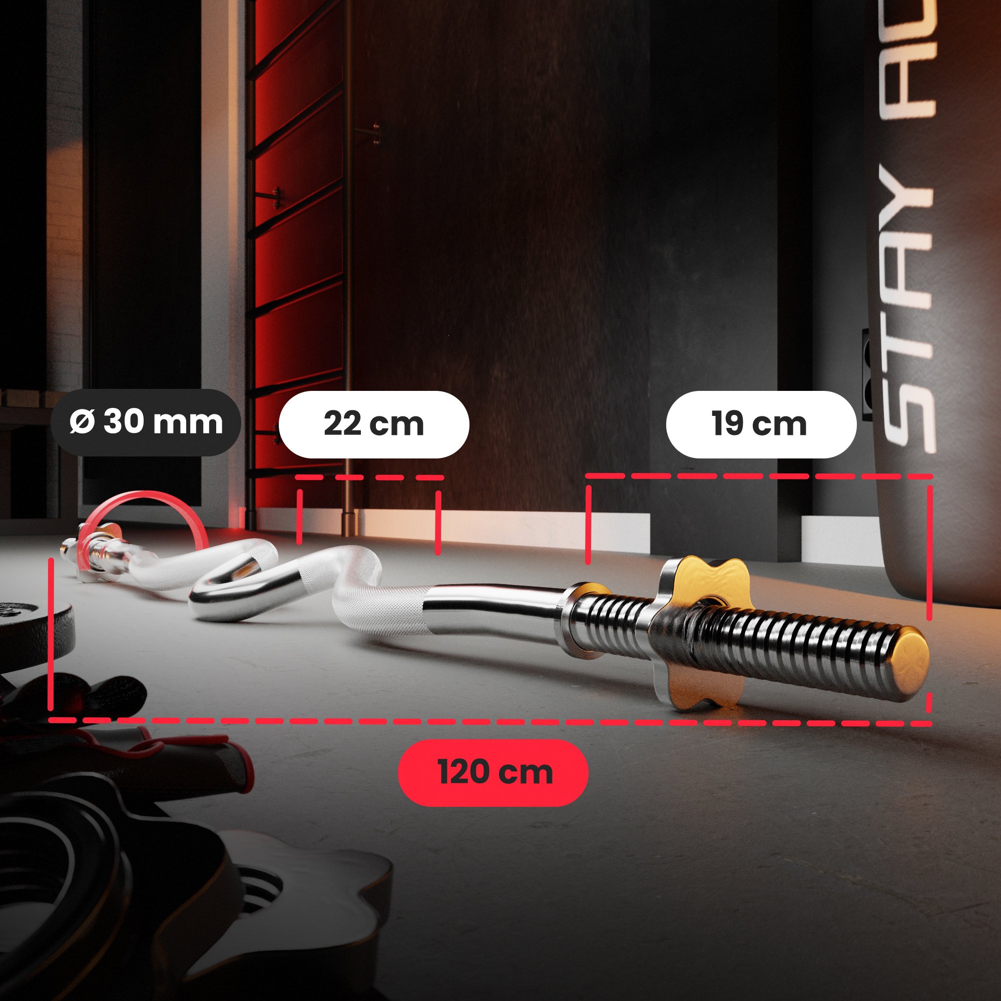 Las dimensiones del equipo han sido perfeccionadas para que esté máximamente adaptado para ejercicios diarios en el gimnasio de casa. La barra fuertemente curvada de 120 cm es ideal para pesas, y su construcción permite entrenar principalmente las partes superiores del cuerpo. Al ejercitarse con la barra fuertemente curvada se involucran especialmente los bíceps, tríceps y brazos, sin exponer las muñecas a una carga excesiva.