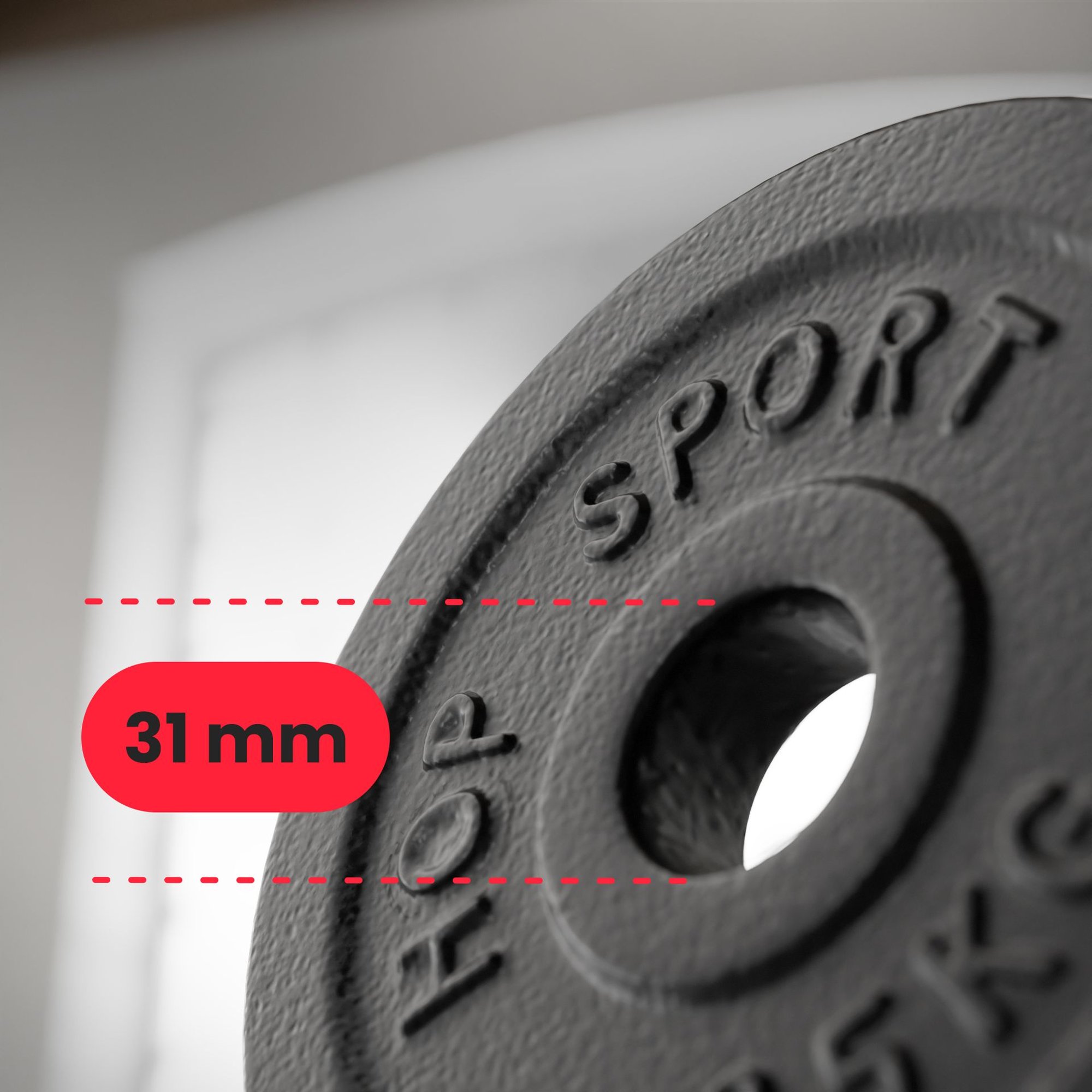 Las pesas de hierro son perfectamente adecuadas para el entrenamiento de fuerza. Tienen un tamaño reducido, lo que te permite colocar más peso en la barra, aumentando así los efectos del entrenamiento de fuerza. Los discos de hierro fundido tienen un orificio universal de 31 mm de diámetro. Se adapta a la mayoría de las barras estándar con un diámetro de 30 mm.