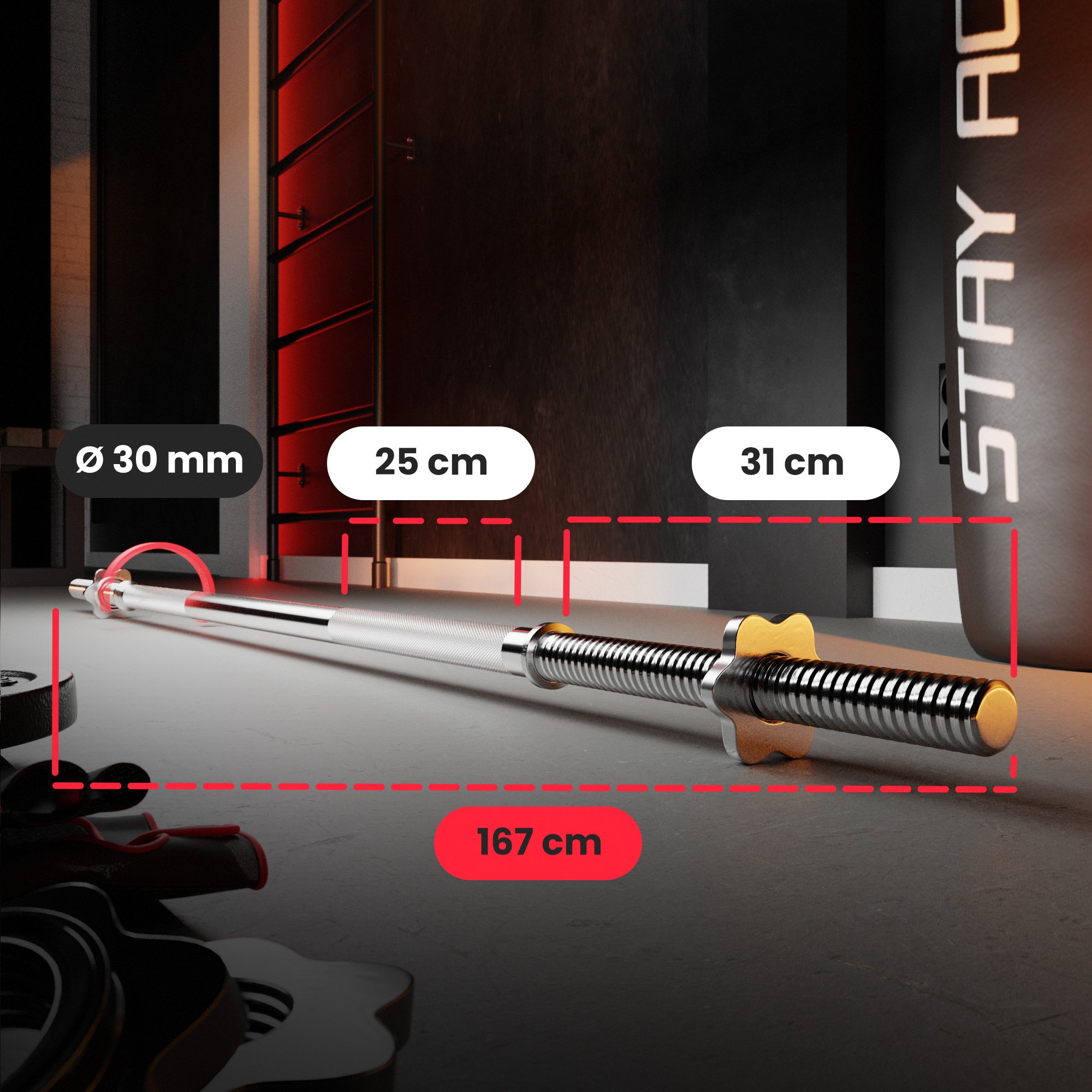 Las dimensiones de la barra han sido adaptadas de tal manera que el entrenamiento con ella brinde máximos beneficios. La superficie roscada es de 13 cm, lo que te permite colocar en ella un número óptimo de pesas y podrás progresar en los entrenamientos diarios. La barra de acero de 40 cm, gracias a su parte de agarre estriada, se sostiene firmemente en las manos, y su diámetro universal de 30 mm se adapta a la mayoría de las pesas estándar, disponibles en el mercado.