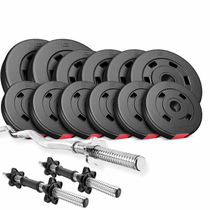 Barra de 36 kg con posibilidad de ajuste de peso. Barras de acero resistentes y discos bituminosos forman la combinación ideal para cualquier tipo de entrenamiento.