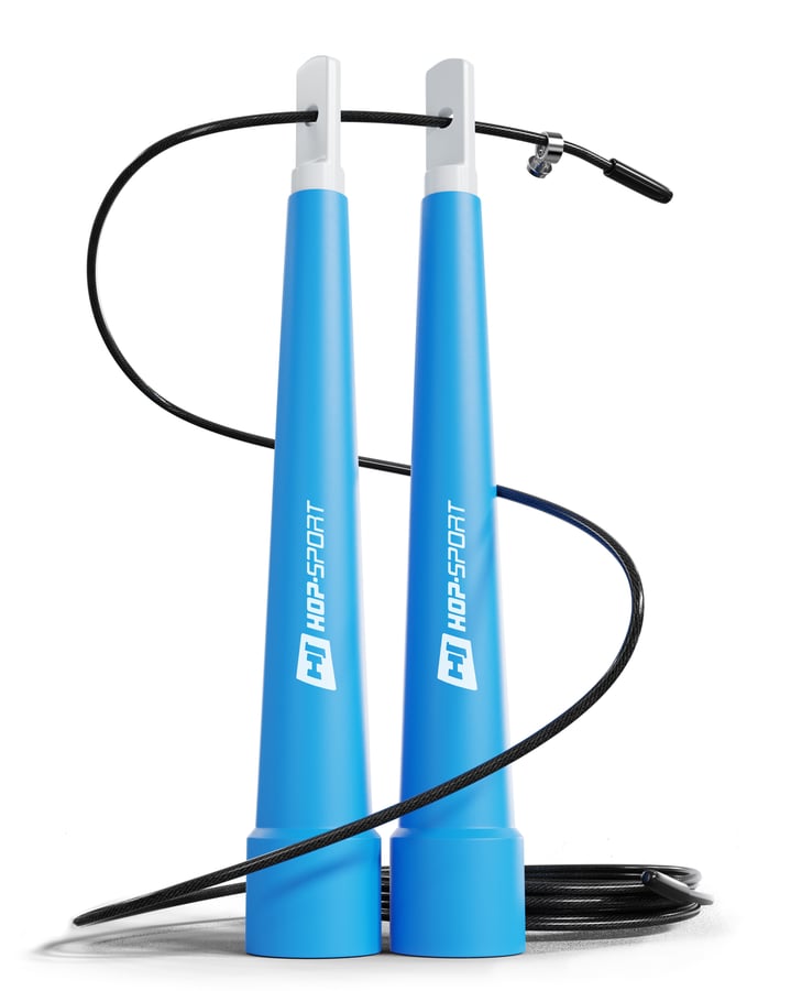 Cuerda para saltar de plástico Crossfit azul Hop-Sport, cuenta con mangos cómodos y un cable metálico ajustable de 300 cm, ¡ideal para diversificar tu entrenamiento!