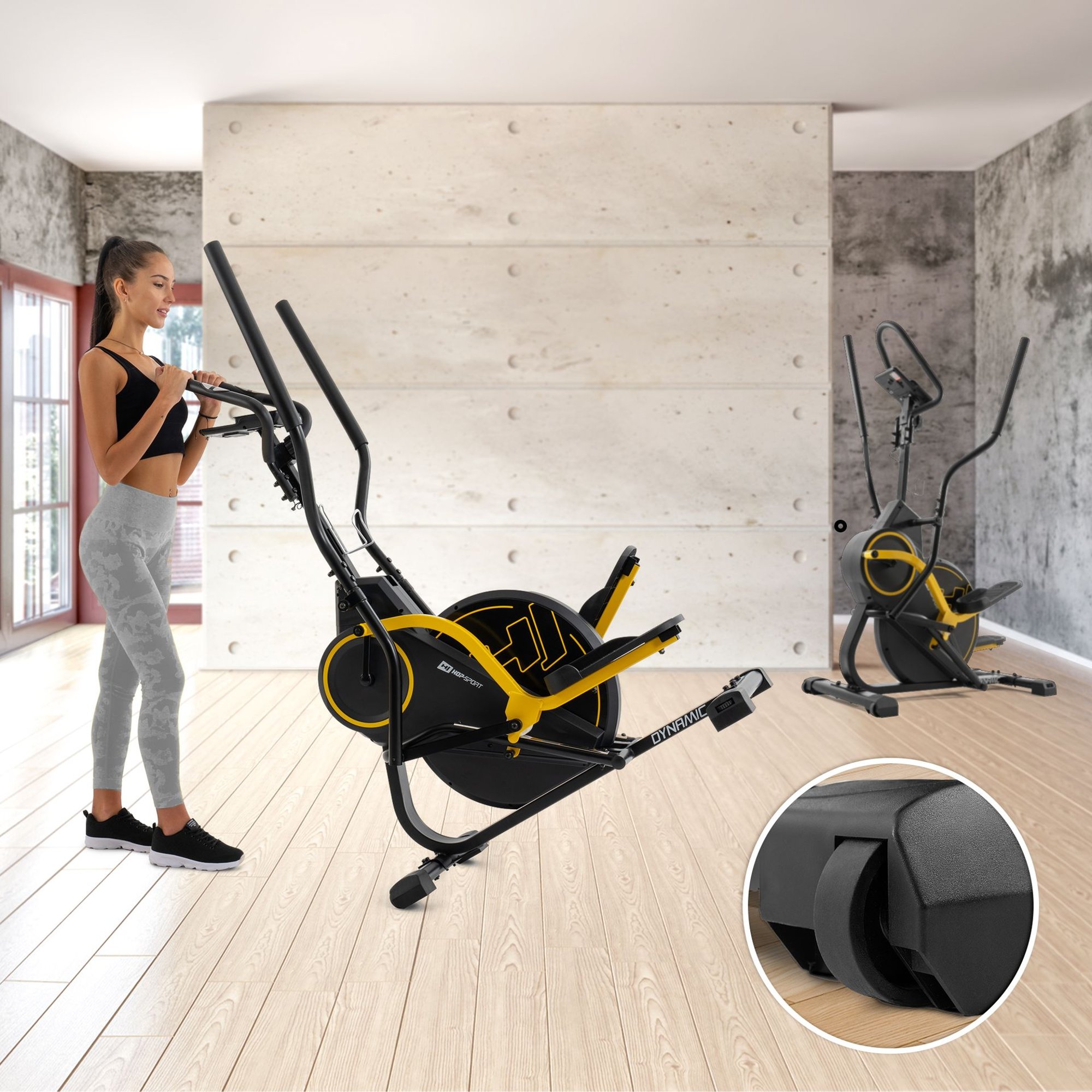 Climber Dynamic pertenece a los equipos de fitness móviles. A diferencia de una elíptica clásica, tiene una construcción extremadamente compacta y dimensiones reducidas. Puedes guardarlo incluso en un apartamento pequeño o estudio. Sin embargo, si deseas moverlo, no hay problema. Climber tiene ruedas de transporte convenientes, gracias a las cuales podrás moverlo a la habitación que elijas.