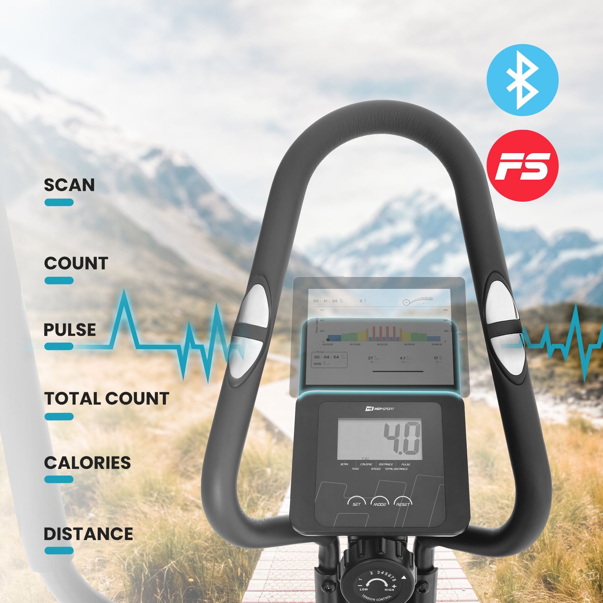 ¡Mantén un ojo en tu forma con la computadora de entrenamiento intuitiva equipada con soporte para dispositivos móviles! Coloca en ella tu tableta o smartphone, donde podrás reproducir tu serie o música favorita para entrenar. La computadora de entrenamiento permite medir los parámetros más importantes del entrenamiento. ¡Además, también mostrará tu pulso! Solo necesitas colocar tus manos en los sensores ubicados en los mangos y seleccionar la función adecuada en la pantalla. Gracias al uso de Bluetooth, tienes la posibilidad de conectar tu dispositivo móvil con Dynamic y utilizar, por ejemplo, la aplicación móvil FitShow y Kinomap .