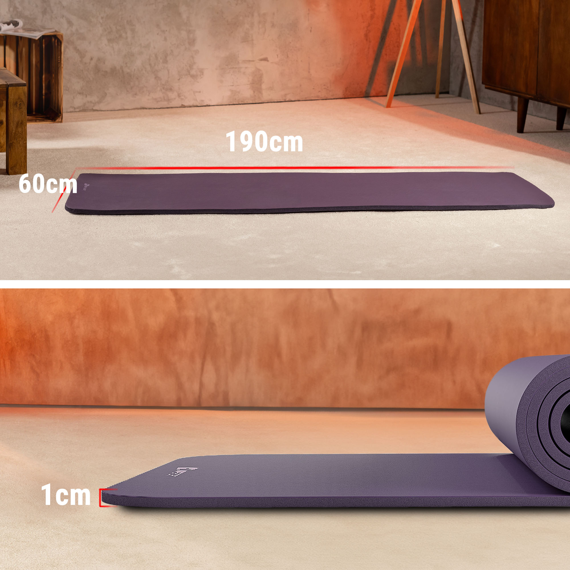 Esterilla NBR antideslizante y duradera de color violeta con un grosor de 1 cm de la marca Hop-Sport. Dimensiones adaptadas a las necesidades para garantizar comodidad y conveniencia en los ejercicios.