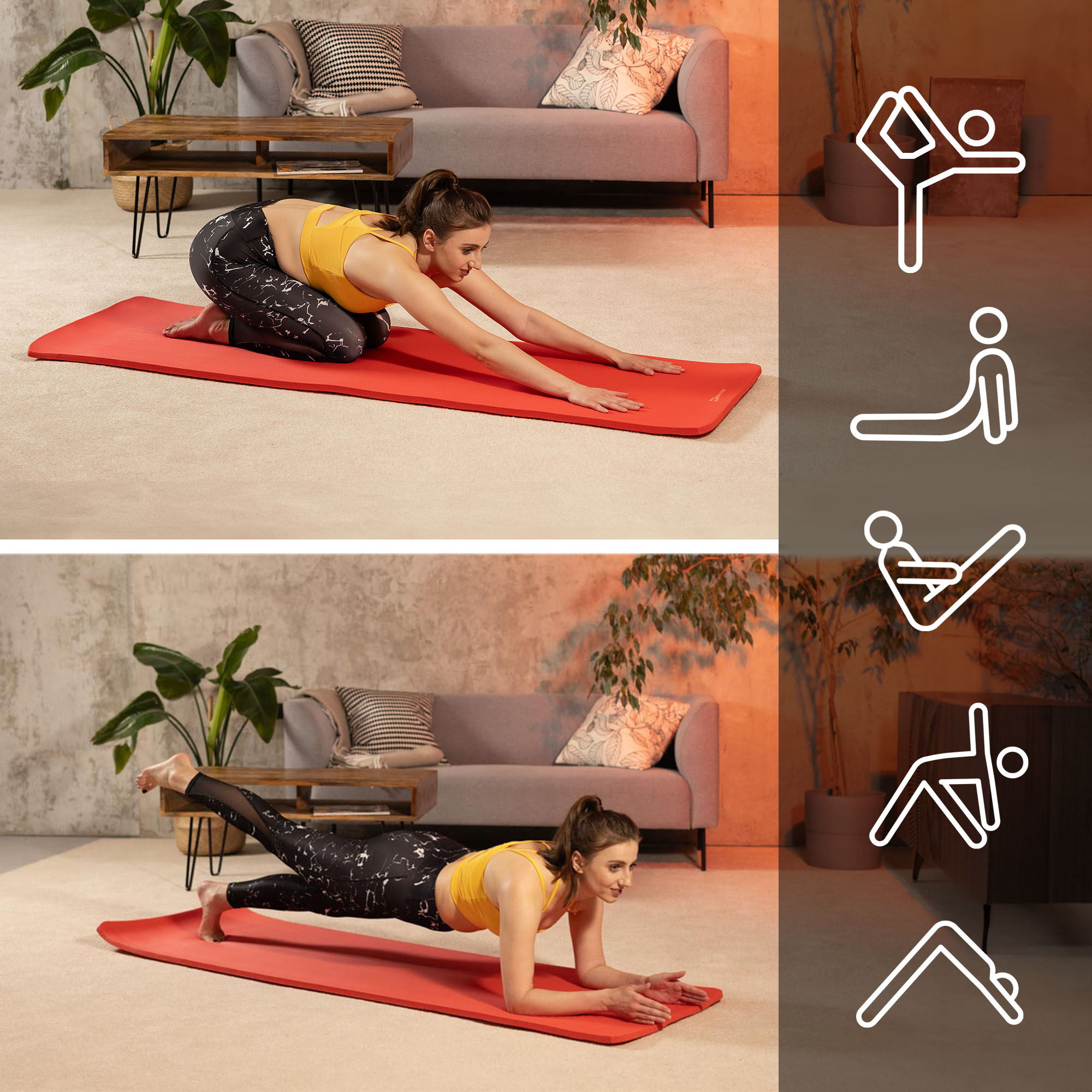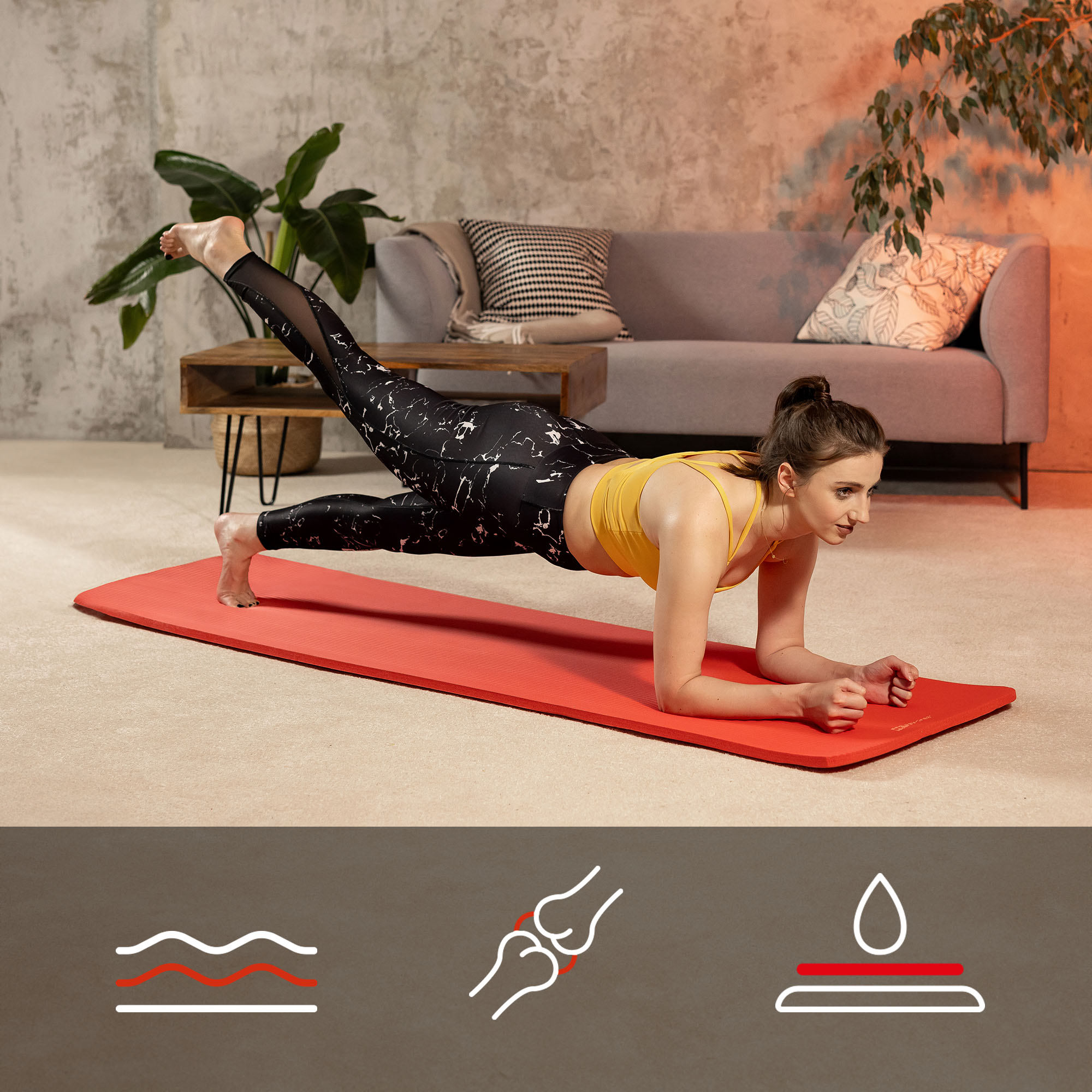 La esterilla NBR de 1,5 cm se puede utilizar en diferentes tipos de entrenamientos. Puedes practicar yoga, pilates, realizar cardio dinámico y ejercicios de fuerza que generan mayores cargas en las articulaciones y requieren un aislamiento y amortiguación adecuados del suelo duro. La combinación del grosor de 1,5 cm con las mayores dimensiones de la esterilla, garantiza comodidad y seguridad en cada sesión de entrenamiento. Además, la estructura única de la esterilla proporciona una excelente adherencia, lo que permite mantener posiciones estables y realizar movimientos complejos con precisión durante los entrenamientos de fuerza.