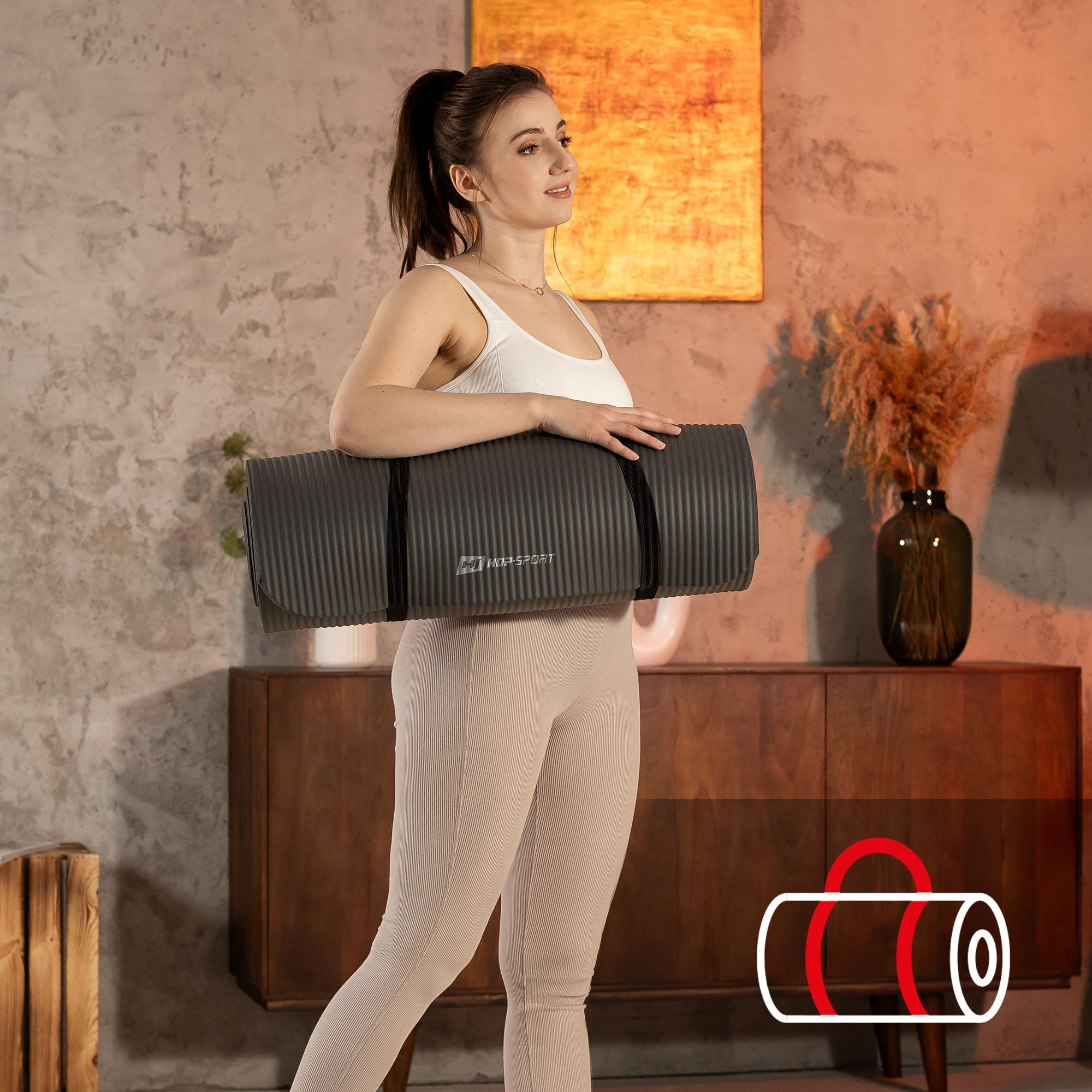 Puedes llevar cómodamente la esterilla Hop-Sport contigo a clases de yoga, fitness, al parque o a la playa. No necesitas una bolsa especial ni una funda. Con la esterilla NBR de 1 cm recibirás una correa de transporte, que facilitará llevarla contigo a donde lo necesites.