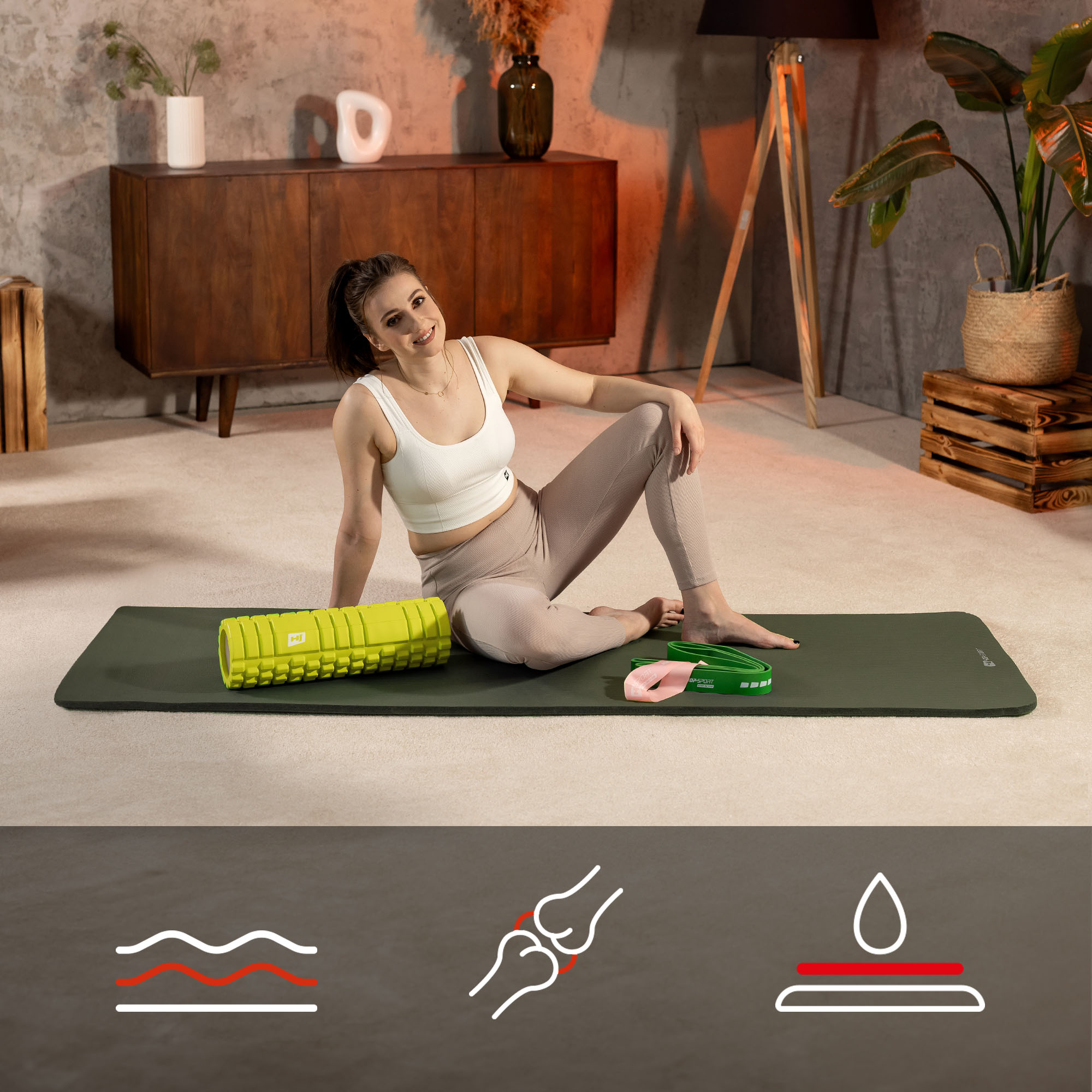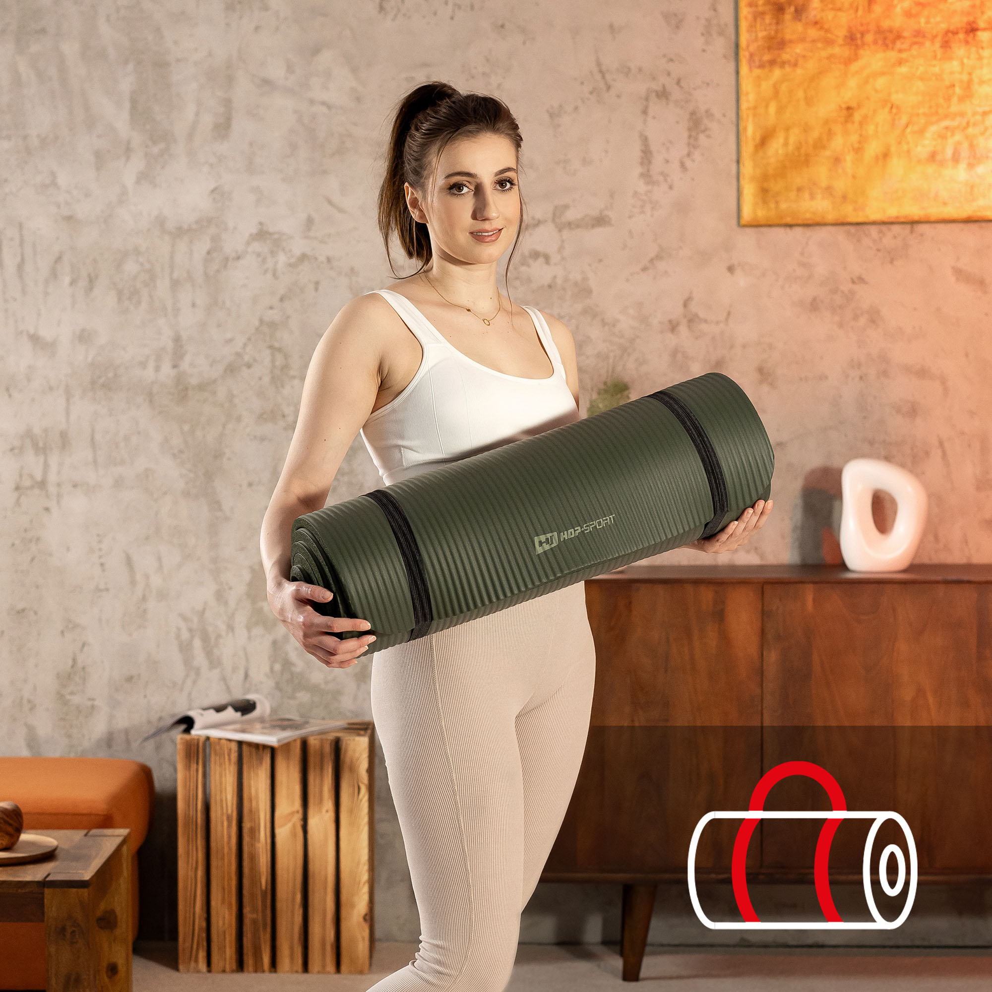 Puedes llevar cómodamente la esterilla Hop-Sport contigo a clases de yoga, fitness, al parque o a la playa. No necesitas una bolsa especial ni una funda. Con la esterilla NBR de 1 cm recibirás una correa de transporte, que facilitará llevarla contigo donde lo necesites.