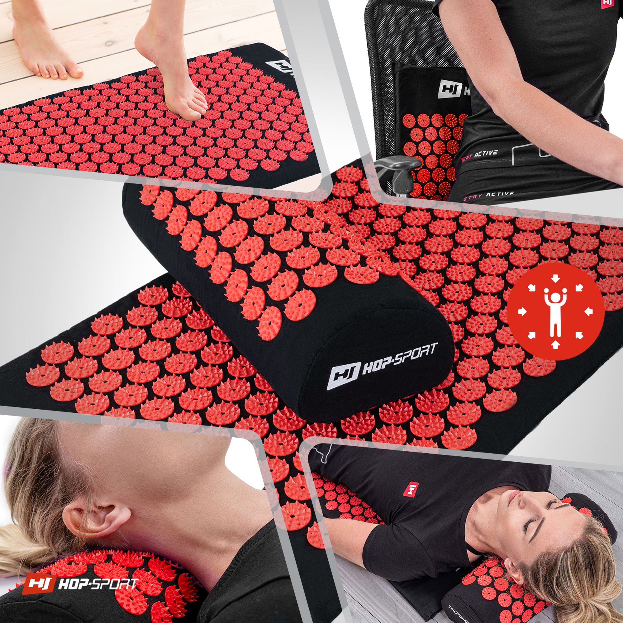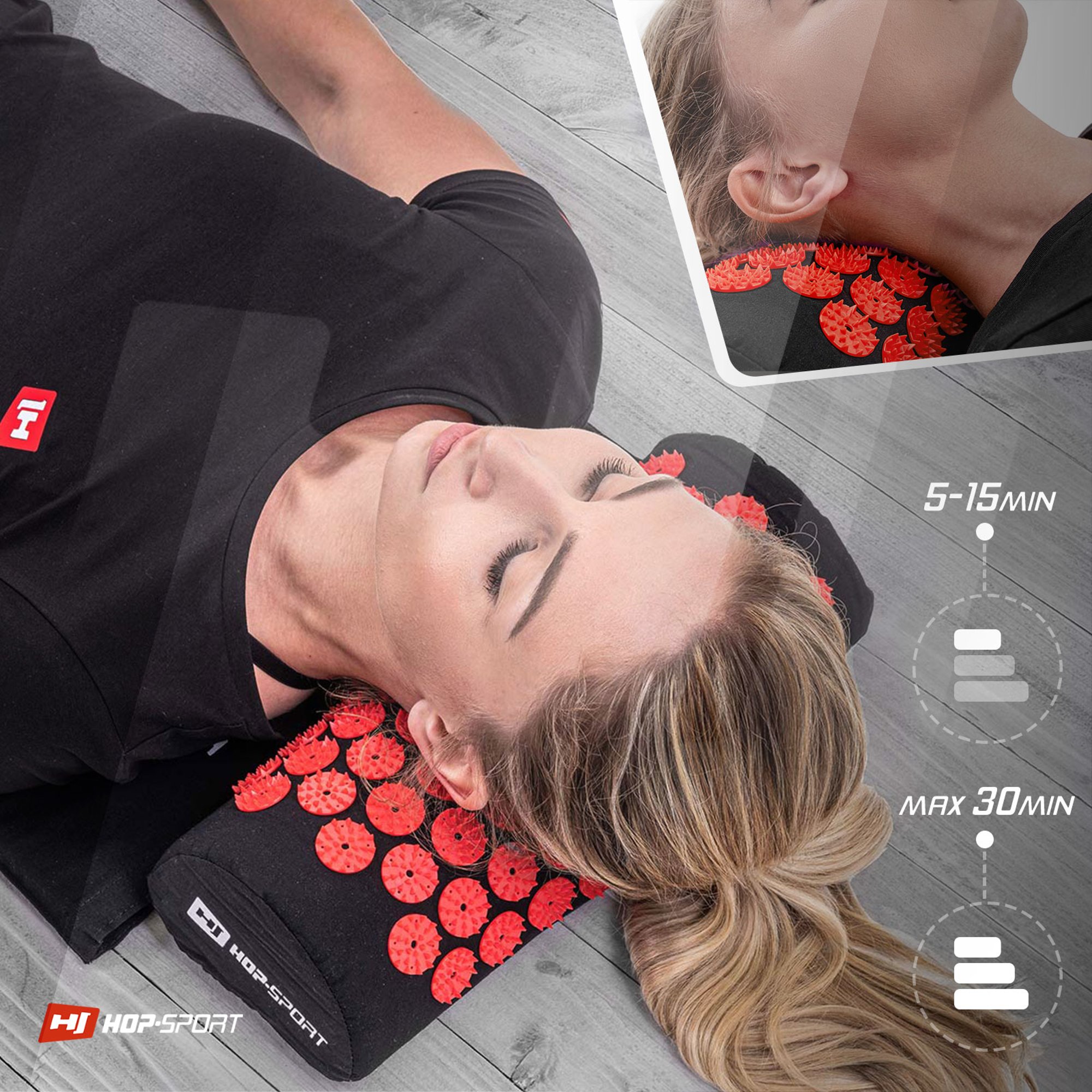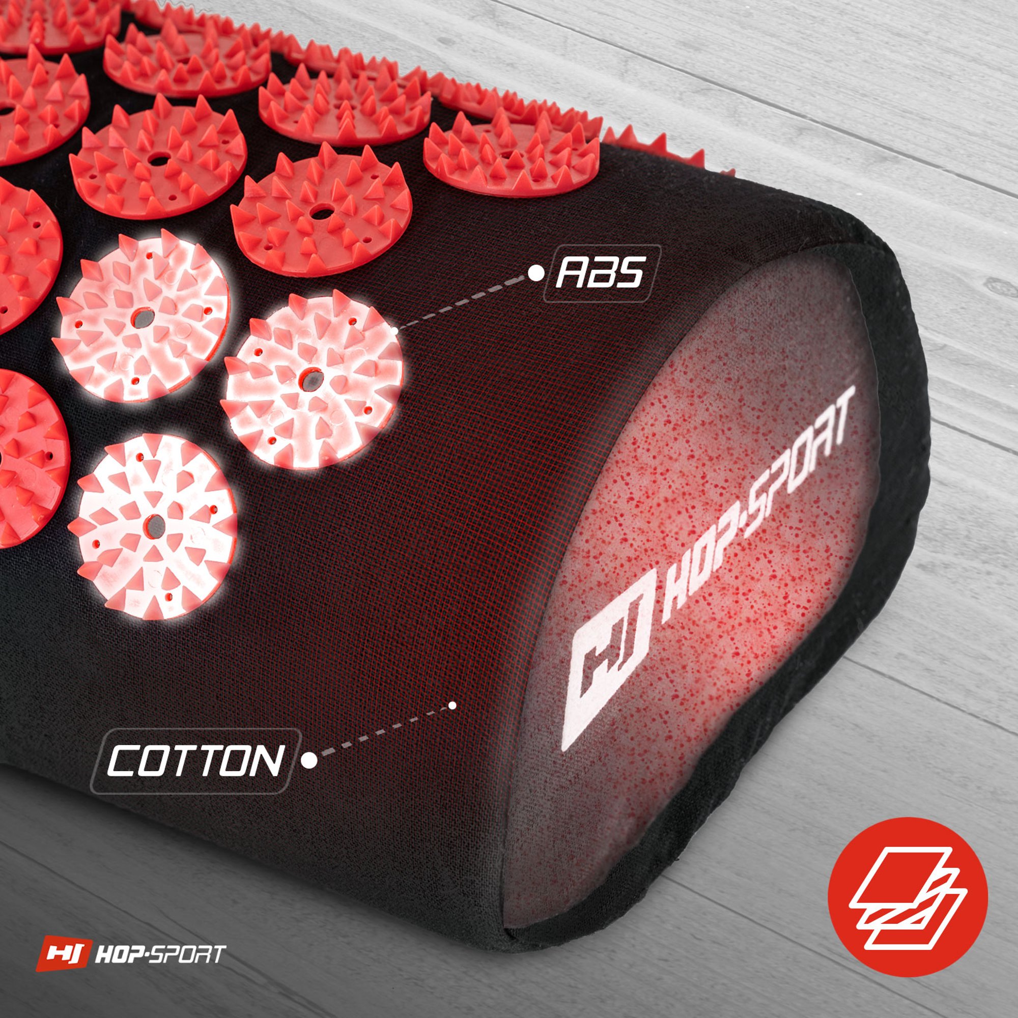 El conjunto de acupresión Hop-Sport está hecho de 100% algodón con un relleno de espuma suave. Las rosetas de masaje están hechas de plástico seguro (ABS). La funda de la almohada es desmontable, por lo que si es necesario, puedes lavarla a mano con un detergente suave (nota: no se debe lavar la funda en la lavadora ni secarla en secadora eléctrica).