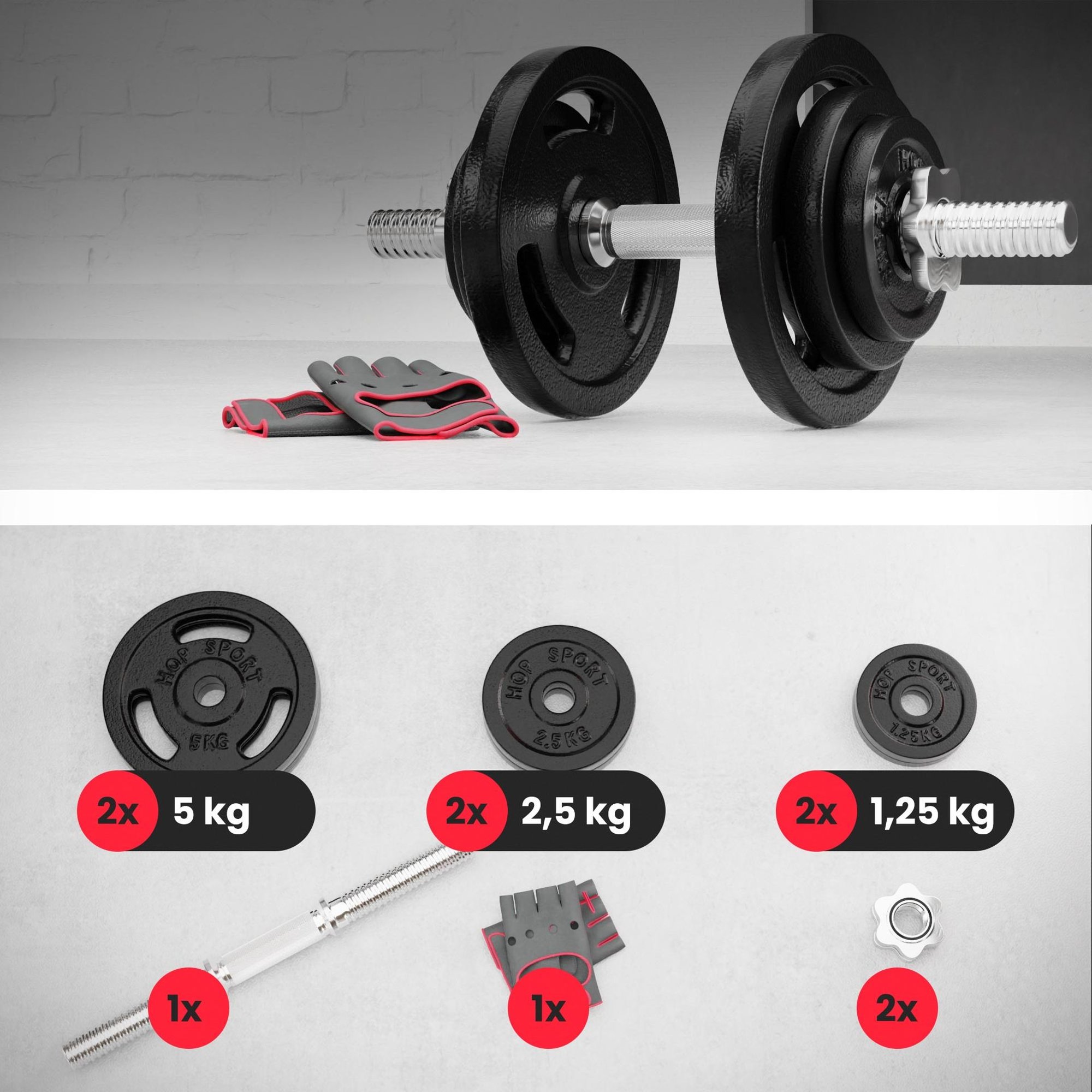 Mancuernas de hierro fundido 1x20kg es un equipo destinado al entrenamiento de fuerza, dedicado a personas que valoran la más alta calidad de fabricación y buscan un equipo que sirva durante años. Lo que distingue a las mancuernas de hierro fundido es su durabilidad y resistencia a los daños. El conjunto incluye: discos de fundición completa de hierro, cubiertos con una capa de laca anticorrosiva, barra hecha de acero cromado de alta calidad con parte de agarre antideslizante y extremos roscados, y cierres para asegurar los pesos. Para ampliar las opciones de entrenamiento, los pesos de 5 kg están equipados con cómodas asas, gracias a las cuales podrás realizar ejercicios como sentadillas, zancadas o peso muerto. Además, a las mancuernas de hierro fundido hemos añadido guantes de neopreno para ejercicios en tamaño universal, que eliminan el riesgo de formación de callos y rozaduras durante el entrenamiento.